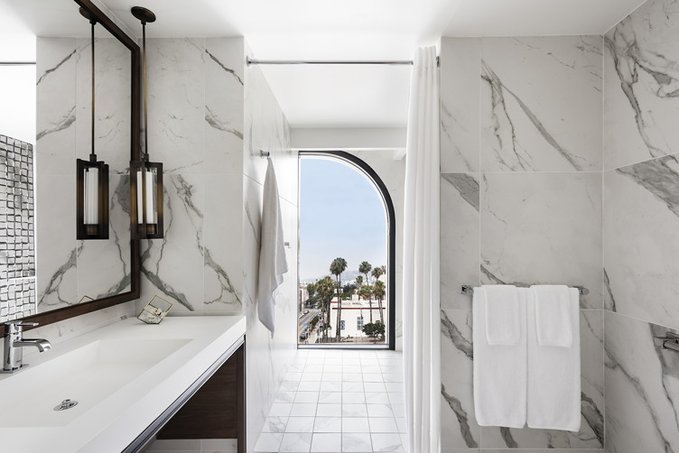 The interiors are designed by the award-winning architecture firm Rockwell Group and pay homage to Los Angeles’ iconic mid-century modern architecture, balanced by garden inspired elements, plush upholstery and more, creating the perfect blend of hyper-chic and comfortable. The building’s unique façade is designed by LA-based Killefer Flammang Architects. The hotel features 178 guest rooms and suites, including an 1,800-square-foot Guest House suite with private screening room and 360-degree views, a stunning indoor-outdoor double-height lobby with retractable Nana Walls, a sweeping 11,000 sq. ft. rooftop pool, restaurant and lounge with unforgettable views of the Hollywood Hills and Los Angeles skyline. Each room features luxurious black walnut finishes, a cozy sitting area, spectacular views of Hollywood Hills and downtown Los Angeles, rainfall showers, C.O. Bigelow amenities and state-of-the-art technology, including a bedside Apple iPad and complimentary Wi-fi.