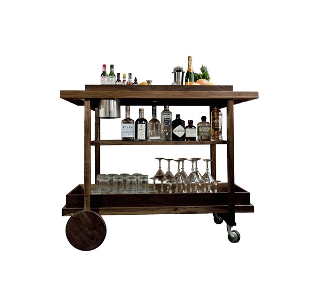 A good bar cart should be a focal point, that draws people together. It doesn’t need to be a big piece, but rather a small, portable table, preferably tiered, that can hold everything the home bartender may need at his or her disposal, glasses, booze, cordials, tumblers, even garnishes. A bar cart should be an elegant piece to compliment any home. Here, two different bar carts offer the same refined, though practical approach, for two very different aesthetics.
