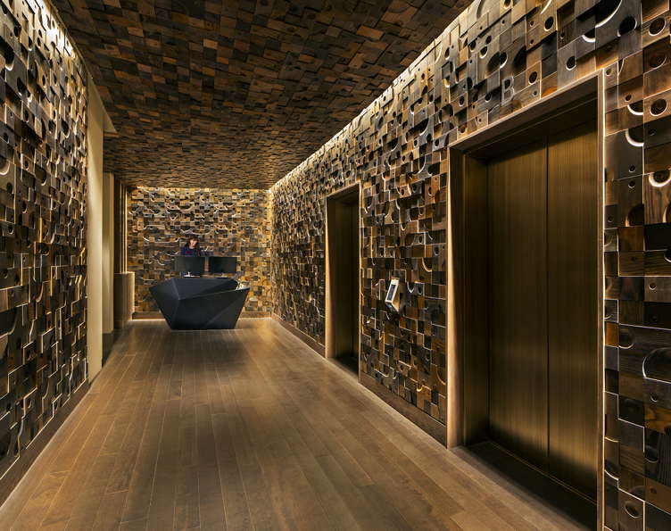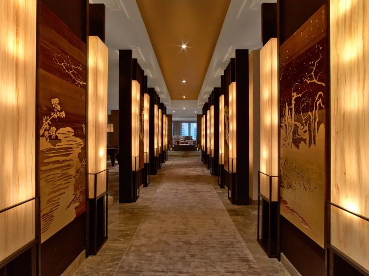 The Nobu Hotel is a hotel within a hotel, a chic and stylish tower located inside Caesars Palace, formerly known as the Centurion Tower. As designed by David Rockwell and the Rockwell Group, guests will find a sleek Japanese aesthetic utilizing natural materials. Raw, natural materials in neutral tones are juxtaposed with hints of terracotta orange, purple and aqua, and unexpected bold graphics representing traditional and contemporary Japanese forms which complement the Japanese-inspired furniture which reflects the influence of George Nakashima. All rooms also have Japanese artwork incorporating traditional prints and expressionist graffiti-like forms selected by Chef Nobu, while bathrooms feature teak fittings complemented by stone tile.