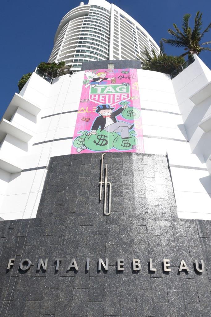 Today, Alec unleashed his artistry on a much larger canvas with a takeover of the Fontainebleau Hotel. façade. Scaling the 40-foot façade, he created a unique art installation that depicts the watchmakers’ logo and Alec’s namesake character. It is to remain on display until the end of Art Basel Miami.