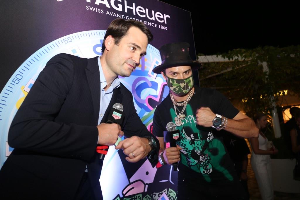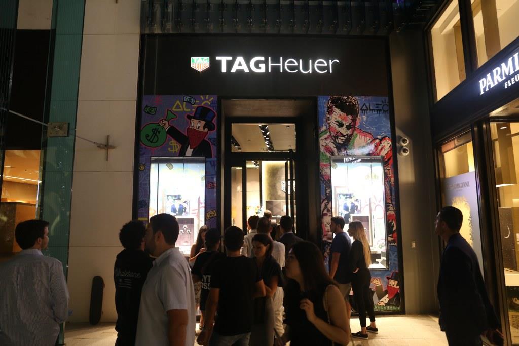 The fete took place this Wednesday at TAG Heuer’s boutique in the core of Miami Design District, where guests enjoyed live performances and Belvedere vodka specialty cocktails, while Alec spray-pained a wall of 300 white rubber straps for the upcoming debut of his limited-edition Connected Modular 45 timepiece.