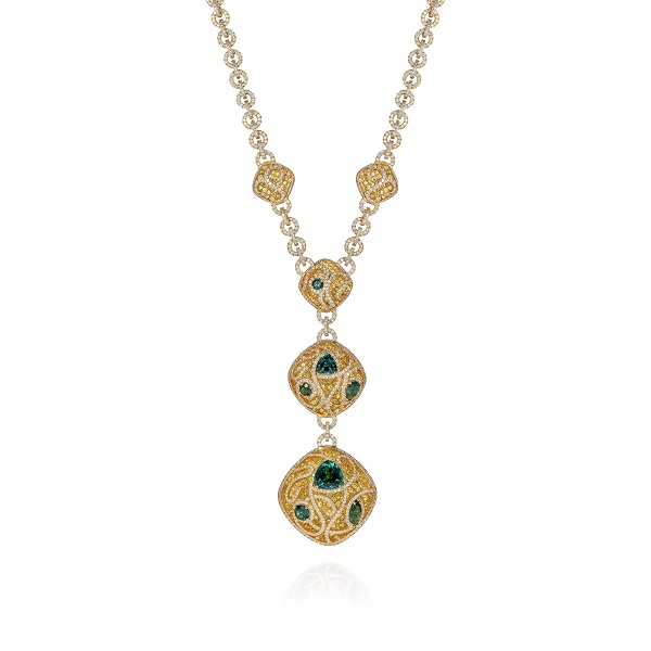 Actress Michelle Rodriguez also walked the red carpet for “Blackkklansman.” She chose a glamorous, one-of-a-kind Gatsby inspired jewelry necklace and ring, set in white gold. Both capture a spring garden in full bloom with dancing peacocks. Perfect for Spring-Summer festivities, this statement necklace features stacked motifs that are adorned with diamonds, emeralds, and sapphires referencing blossom petals and peacock feathers. Alternating sapphire and emerald accents on the motif add visual interest to the bold necklace with a diamond-encrusted collier that entwines along the décolletage.