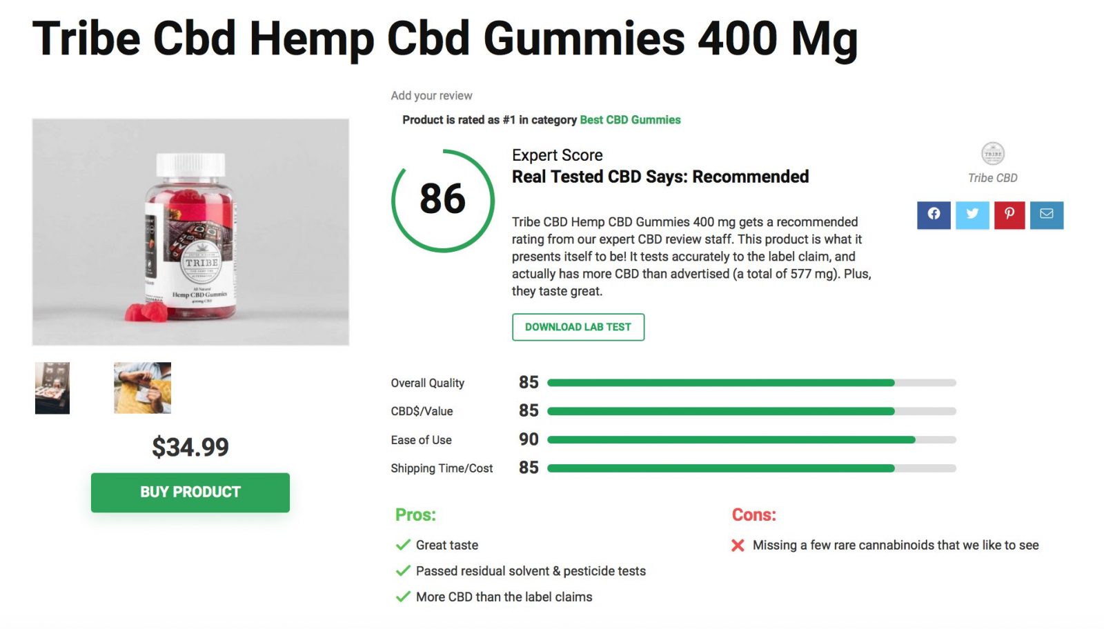 If you are in the market for a tasty CBD treat, Tribe CBD’s Relaxation Gummies in a mixed berry flavor are a great choice for you. These gummies tested over the label claim for CBD with a whopping 577mg, and though they are missing some of the rare cannabinoids we like to see from a broad-spectrum product, they are still ranked number one in our Best CBD Gummies category.