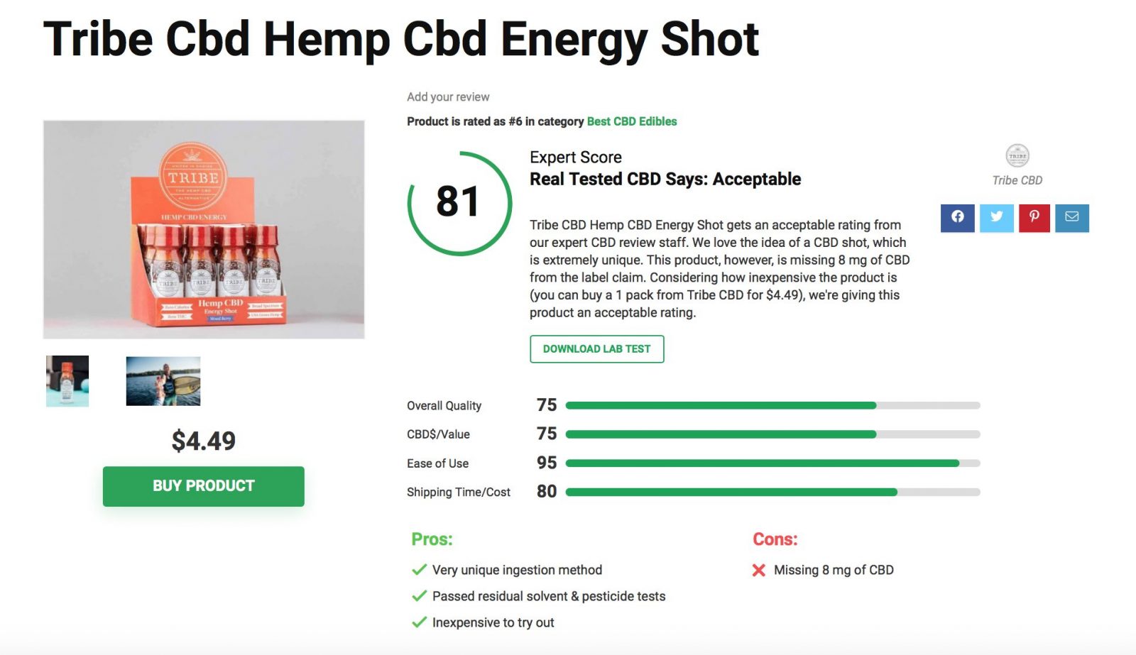 One of the most unique CBD products we have tested to date is Tribe CBD’s Energy Shots. These little on-the-go shots combine CBD with caffeine, ginseng, and guarana for the perfect boost to get you going. These CBD shots are a super affordable option for consumers and come in a tasty mixed berry flavor. This CBD drink is broad-spectrum and contains some of the rare cannabinoids we like to see, but is missing a few milligrams of CBD, but based on the price, these CBD shots are still a great option and a unique product.