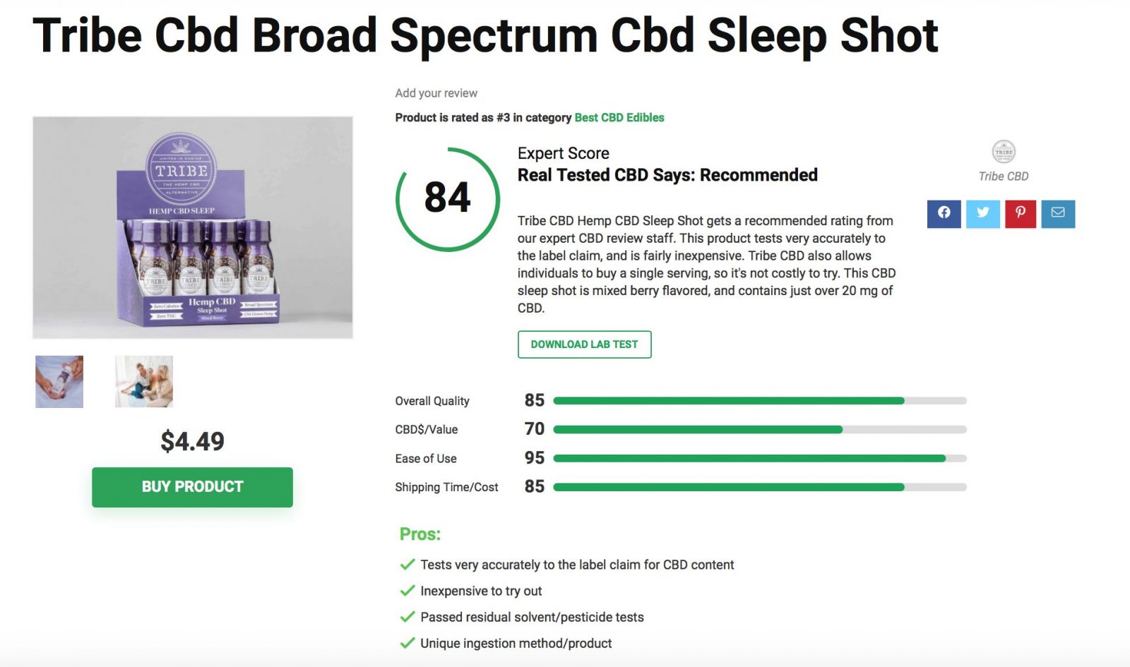 Another amazingly unique product from Tribe CBD is their Broad-Spectrum CBD Sleep Shot. These little CBD drinks are similar to the Energy Shot, but with the opposite effect. Combining CBD with melatonin, valerian root, and Baikal skullcap flower these CBD shots can promote restful sleep, one of the many potential therapeutic properties of CBD. These sleep shots test very accurately to the label claim and contain just about all the rare cannabinoids we like to see (apart from THC). If you are looking for a natural sleep aid that is easily consumed, these could be a great choice for you.