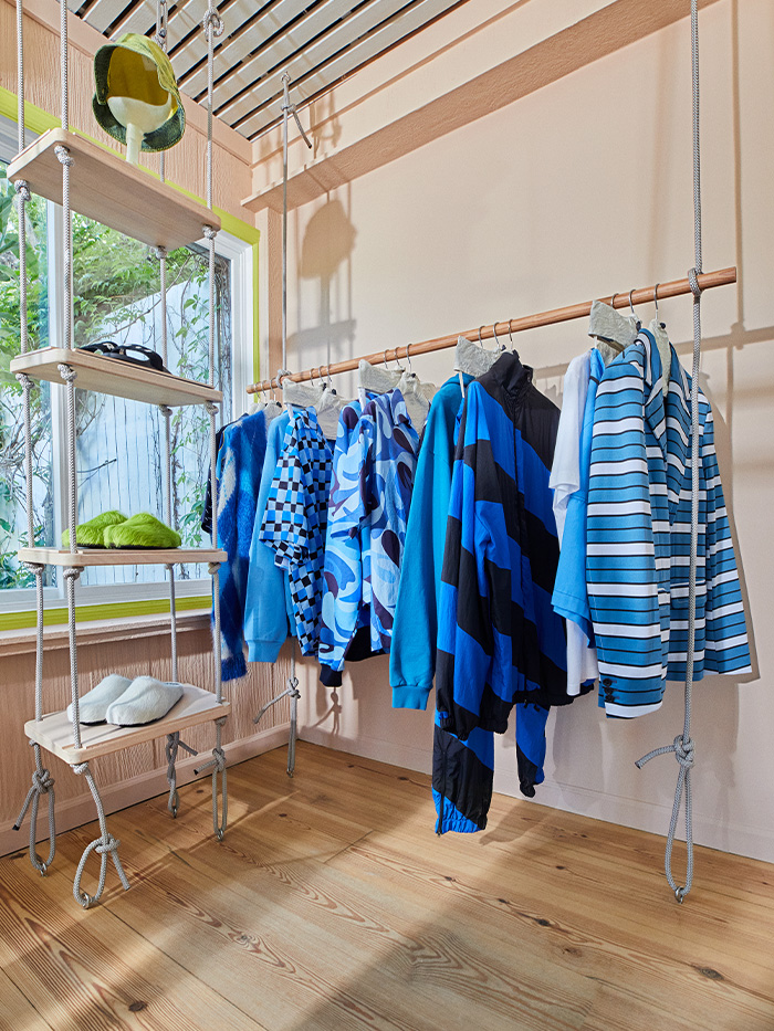 So pack up the car and make a summer getaway in style. In this imaginative surfer shack overlooking the ocean, guests can kick back and enjoy sun-kissed days on the shore and get their Marni Marine on!