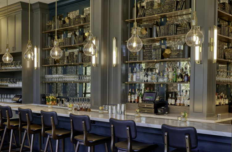 The bar at Ovide is a beautiful place to sit and relax if you’re dining on your own or if you simply wish for a less formal meal. It’s a gorgeous space, with extensive millwork, a large, antiqued mirror, and brass accents. Black and tan upholstery with brass details and beautifully