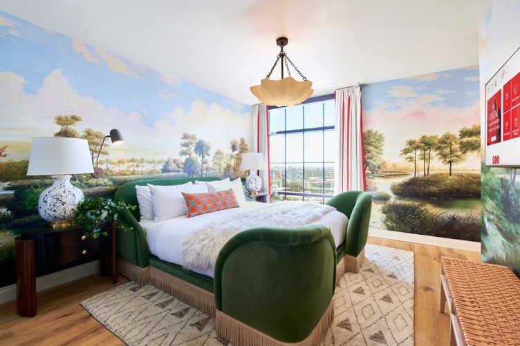 On the opposite end of the spectrum is the young, hip Virgin Hotels New Orleans, the fifth of Sir Richard Branson‘s American hotels. Located in the city’s artsy Warehouse District, the property, as designed by NOLA-based firm Logan Killen Interiors, reflects comfortable environments with local touches, historical details, and a nod to New Orleans Art Deco history interspersed throughout. These influences include playful wall art in from New Orleans artist Jen Talton, local art students in The Shag Room, works from photographer Augusta Sagnelli and an abstract painting from Ansley Givhan. The artwork helps to create the “at home in New Orleans” feel that permeates the hotel.