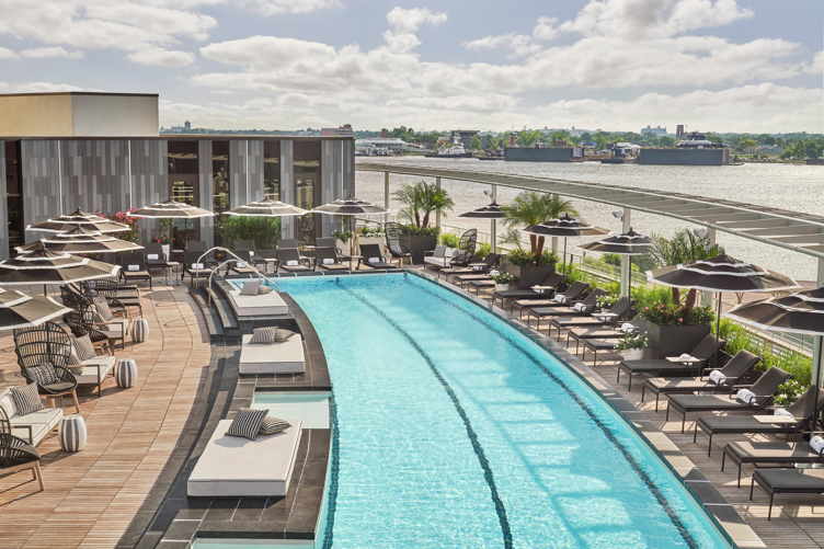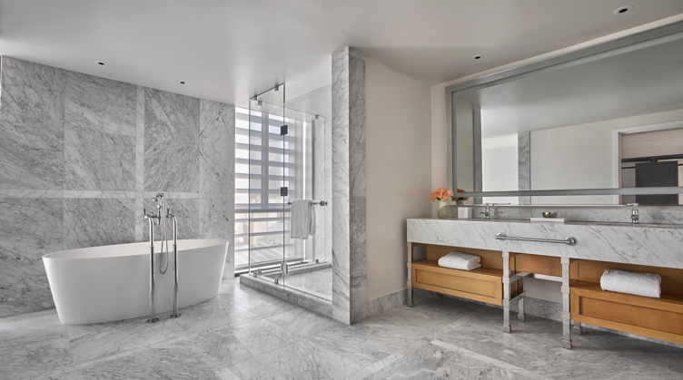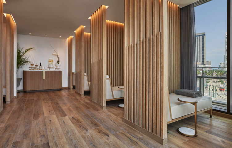 Complementing modernist architect Edward Durell Stone‘s world-class design is a carefully-curated art collection, featuring local artists and those inspired by the city. Set within indoor and outdoor observation decks on the Hotel’s 33rd and 34th floors is a state-of-the-art cultural exhibit designed to honor, celebrate and share stories of the diverse cultures that create the magic of New Orleans. This fall, the hotel will open its crescent-shaped rooftop swimming pool, featuring four private cabanas and Mississippi River views; a 24/7 fitness centre conceived by trainer to the stars Harley Pasternak; and The Spa, where Spa Director Toni Sullivan’s team of highly trained therapists will customize treatments to get guests looking good and feeling good… especially those whose who have been doing a little too much “laissez les bon temps roller.” At 5,525 square feet , this fifth floor behemoth will feature eight treatment rooms, including a couple’s room, two relaxation rooms, a sauna, steam and Jacuzzi facilities, with design elements that incorporate raw white oak, shutters, gray travertine, rattan, and abstraction of wrought iron silhouette-projecting lamps. A quarterly program of visiting experts will welcome some of the most sought-after aestheticians and wellness therapists from across the United States, though treatments like the Southern Gentleman — a therapeutic massage using a warm infusion of rye whiskey oil plus a post-massage cocktail and snack — are always on the menu.