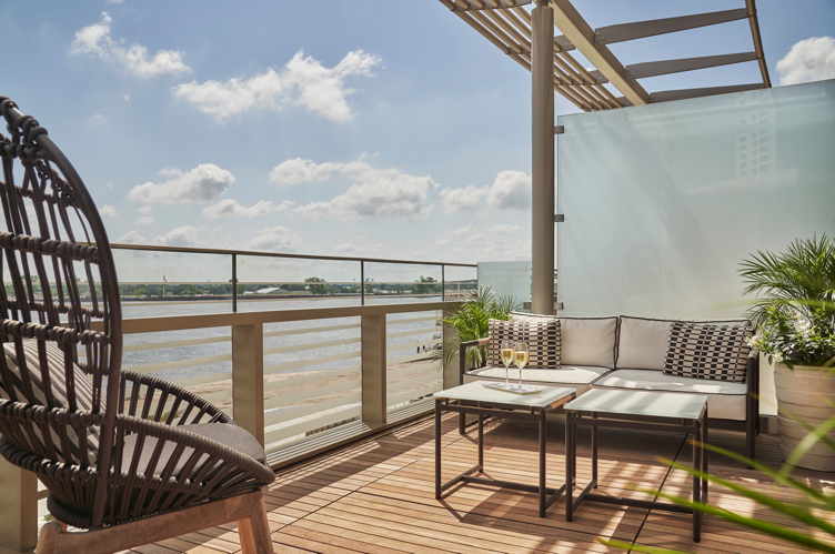 The newest — as of August 2021 — and absolutely the most glamorous place to stay is the Four Seasons New Orleans, located on the Mississippi waterfront at the foot of Canal Street, just 20 minutes from both of the city’s airports, steps away from the French Quarter and the Warehouse Arts District — making it a prime spot for just about everything (including proximity to the Central Business District for business travelers and sports fans given it’s a hop, skip and a jump from the Superdome and Smoothie King Center). 341 light-filled, spacious and beautifully-appointed rooms and suites designed by Bill Rooney Studio with a palette of clean whites and pale greys, accentuated with white-washed oak furnishings, textured fabrics and wall treatments and, above every bed, a striking tri-panel plaster relief depicting South’s signature scent, the magnolia, offer a soothing place to sleep. Altogether, there are 280 guest rooms, 61 one and-two-bedroom suites ranging in size from 683-2,056 suite and two Presidential Suites, sized at 2,439 square feet apiece. All rooms feature a 65-inch flat screen TV, iPad for in-room controls, Nespresso coffee machines and tea kettles; and L’Occitane bath amenities, though the Presidential Suites are truly the places to be thanks to private offices; exercise rooms; dining tables for 10; butler’s pantries; a private office/den; and fitness rooms with exercises bikes.