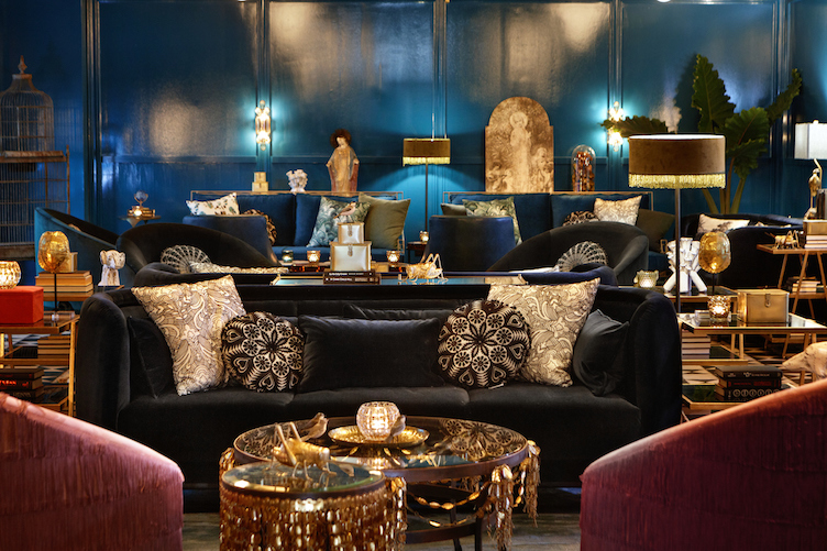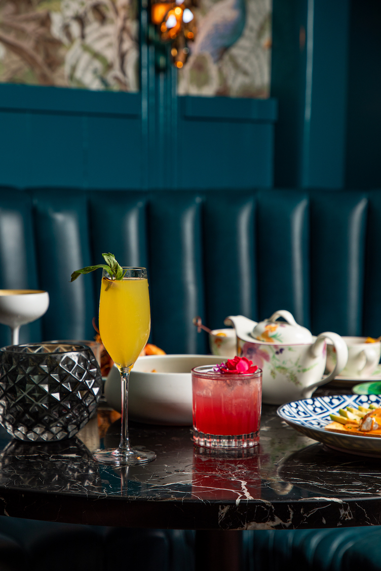 Nestled inside Kimpton Hotel Fontenot, Peacock Room is an elevated, energetic and cultured hangout that draws its inspiration from classic hotel bar rooms and eccentric Southern private clubs. It’s a jewel box of a restaurant, all blues, golds, feathers and fun, influenced by traditional Mardi Gras attire, but in an entirely elevated way. Peacock Room (named as such for the plethora of peacocks on every available surface) also has a distinct atrium vibe, surrounded by glass and lush with botanical accents. A specially designed sawtooth roof allows light to cascade down through several skylights, illuminating the bar, a strong focal point of the space with its gold panel detailing, blue leather bar stools, wall of mirrors and tasseled light fixtures. Black and white traditional Spanish tiles complement white marble French bistro table tops and black metal-framed chairs, a turquoise lacquered wall, leather banquettes, vintage carpets and ornate, plush chairs. The bohemian mix of art, brass hardware, crystal fixtures, velvet upholstery and, naturally, life-sized peacocks and a bird cage, add depth and color in a variety of seating types and groupings, a refreshing take on a classic cocktail bar.