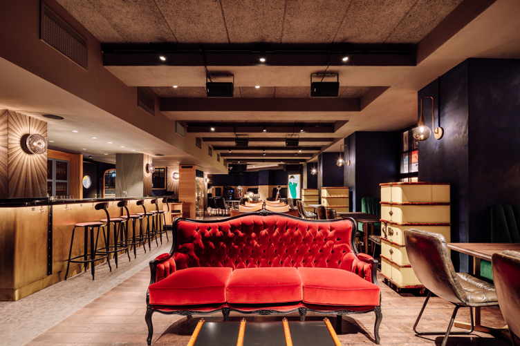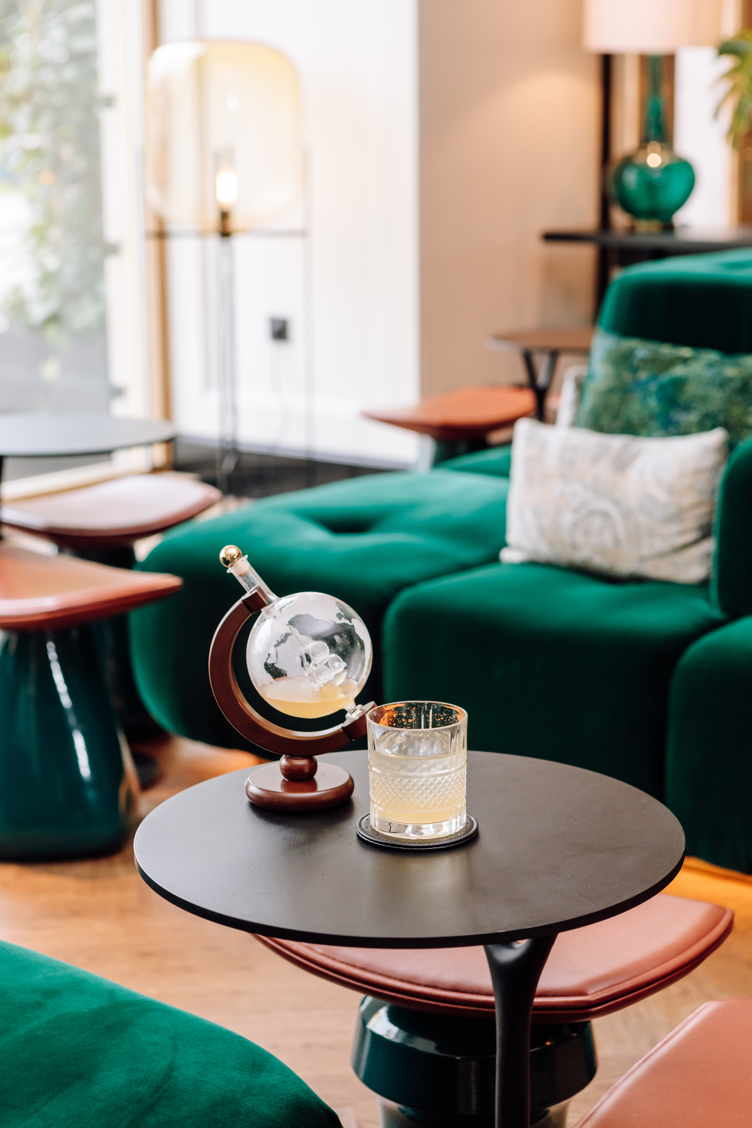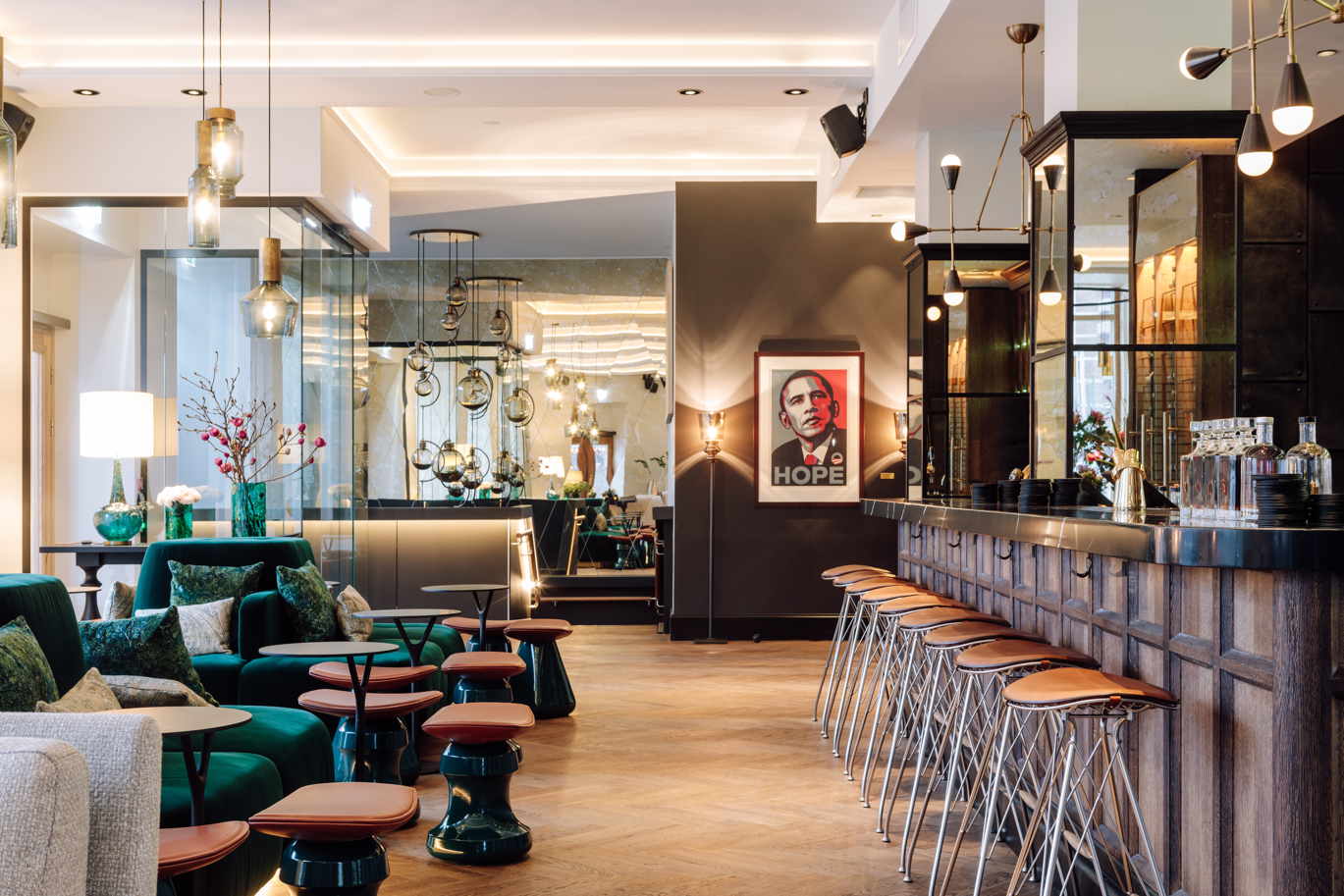 The intimate, 122-room property is layered with equal doses of subtle nostalgic references and forward-thinking design, and is defined not only by its slick rooms, but a standout offering of buzzy restaurants and bars. It’s a beautiful space, defined by high ceilings and commanding paned windows, which either look out onto Jernbanetorget Square, the fjords, or an internal courtyard. Its suites — the Norwegian America Line’s former boardrooms — boast original ornate ceilings; vintage collections of framed maps, photographs, and old dining menus from the ships – uncovered during the building process; original mid-century classic furnishings, like Veng, an armchair designed by Torbjørn Bekken in 1960, Briger Dahl’s Birdie table lamp (1952), and pendant lamps by age-old Norwegian glassblowing company, Hadeland, who also provided the ship’s original glassware; and smoked-glass mirrored walls behind each bed. Everything is bound together by a strong local tie that includes a uniform collection called In Motion by Oslo-based fashion brand, Holzweiler; lighting fixtures and special-occasion champagne glasses – reproductions of the ships’ originals – by glassblowing company, Hadeland; revived Norwegian mid-century furniture and lighting classics from companies Eikund and Northern; and bathroom amenities from local cosmetics brand Sprekenhus. An impressive art collection, curated by Sune Nordgren, takes its cues from America, with works by American figurative painter Alex Katz, former street artist Shepard Fairey, and “Towers”, an 11-foot tall sculpture by British artist Julian Opie which refers to the modernity of America.