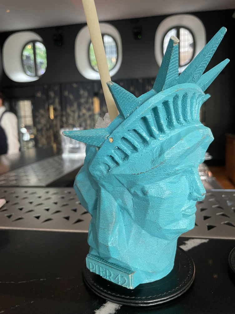 But the hotel’s secret weapon is Pier 42, which, with its low-slung velvet furnishings, parquet flooring, concealed lighting, larger-than-life poster of Barack Obama, and inventive cocktail menu, just won the two most prestigious awards at this year’s Bartenders Choice Awards: Best Cocktail Bar Norway and for Adrian Michalcik as Best Bartender Norway as well as Best bar of the year, best bar team of the year, and best cocktail program of the year 2022 by the Norse Bar Awards. Michalcik’s cocktails are inventive as hell, and given that the theme of the bar is a Norway-meets-America connection, he nails it. The beautiful menu showcases parallels between New York and Oslo in the OG spirit of the Norwegian America Line with drinks in honor of iconic landmarks like the Oslo Opera House and the Statue of Liberty (a gorgeous libation made of Absolut Elyx, green apple, elderflower, gentian, pear, and fresh lemon served in a Lady Liberty head glass); nature — Manhattan-henge and the Northern Lights, the latter of which is served on a brightly blinking nest meant to resemble said lights; museums; sports; neighborhoods; and fashion designers (Norwegian designer Holzweiler and American-born Calvin Klein, who gets his props via Naked Grouse, strawberry, butterscotch, fresh lemon, butter ghee, clarified milk, and Perrier Jouet brut).