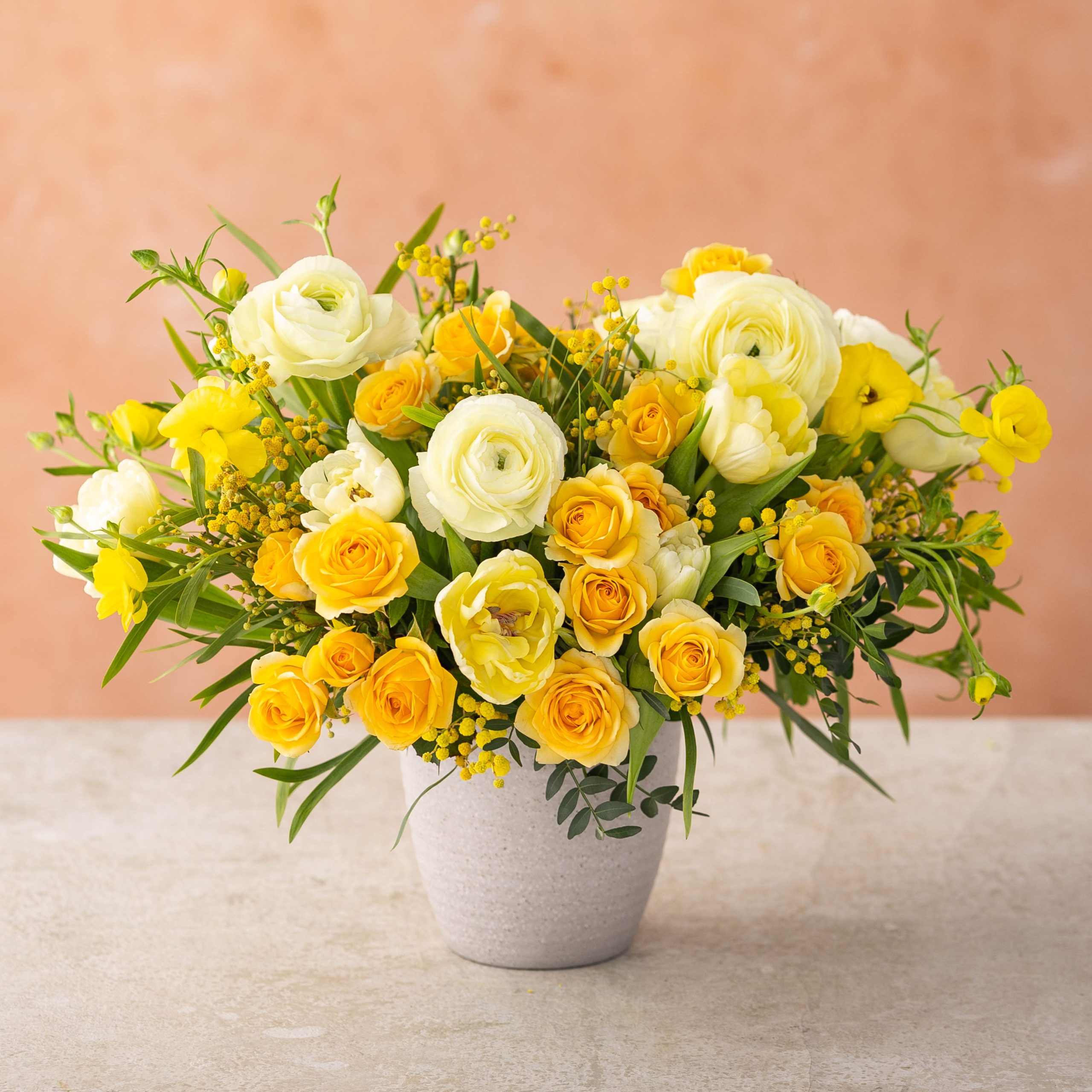 Winston Flowers’ ‘For Women Everywhere’ bouquet brings together the most luminous seasonal flowers to create a meaningful tribute. Cheerful ‘Clooney’ ranunculus and pale yellow ‘butterfly’ ranunculus dance alongside golden spray roses, double tulips, and delicate sprays of mimosa blossoms, creating a luminous and uplifting display. Organically arranged in a textured vase, this exquisite floral arrangement is the perfect way to show appreciation for the inspiring women in your life—be it a mentor, mother, friend, or colleague.