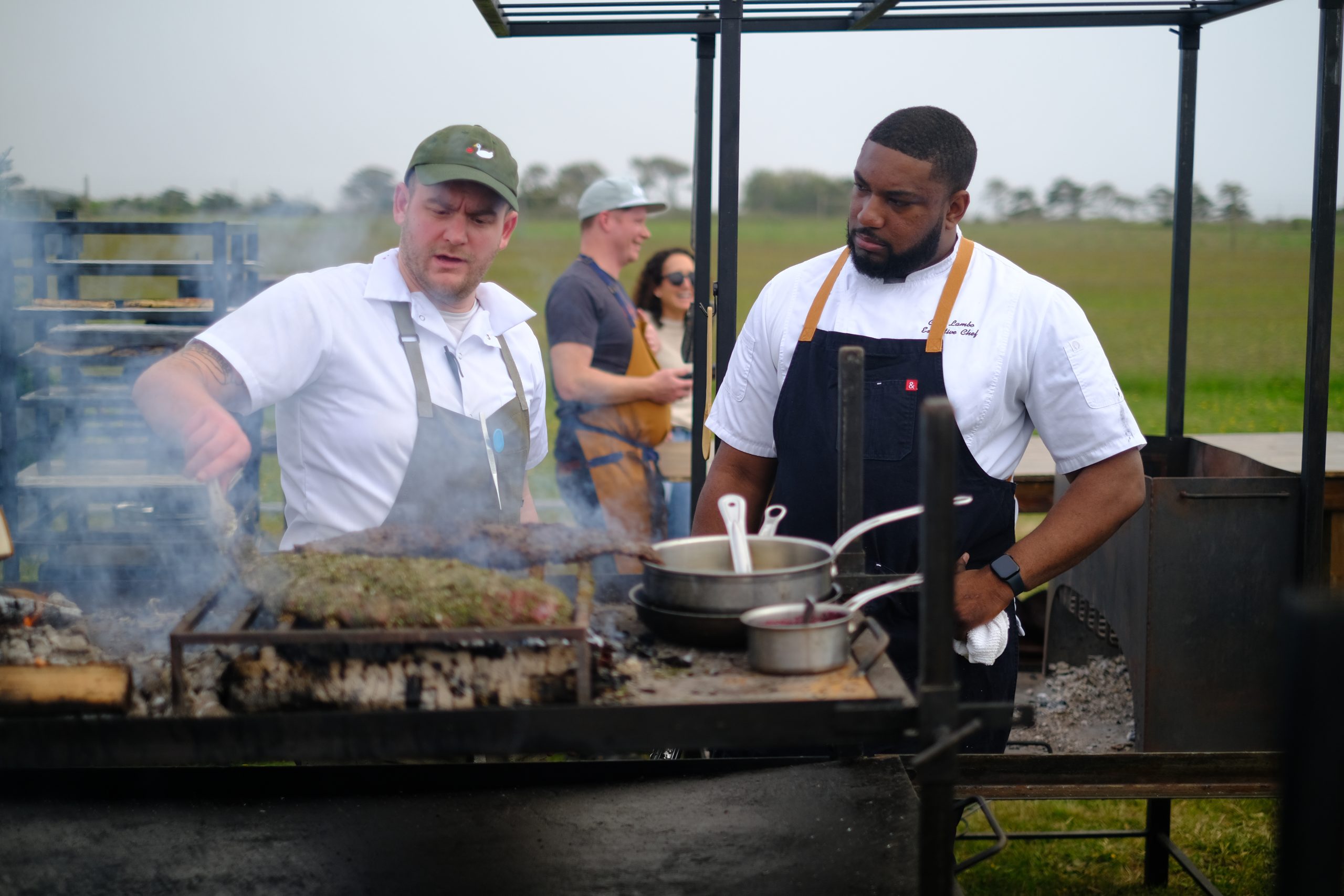 A standout chef during the Grand Tasting and SMOKED! Grill Around the World included chefs like Nick Dixon, Culinary Director & Partner of Prima Italian Steakhouse, Capo Restaurant & Supper Club, Hunter’s Kitchen & Bar, and Lincoln Tavern & Restaurant in Boston who fired up a wood-grilled Wagyu beef, roasted Hudson Valley foie gras, fromage blanc, huckleberry conserva, and thyme blossoms paired with wines including Bideona (Rioja, Spain), Catena Zapata (Mendoza, Argentina), Donnalafigata (Sicily, Italy), and Turley Wine Cellars (Napa, California). “Just as we were gearing up to cook off the wood fire cooking equipment, the fog started to roll in thick. It was picturesque,” reflected Dixon. “We were fortunate enough to work with the Chefs’ Warehouse team, who hand-picked our Wagyu beef, and with Bartlett’s Farm for their beautiful spring asparagus. There is something special and primal about eating food that is at its peak, prepared with love, cooked over wood fire, in the foggy ocean mist. Words can’t describe the moment — you had to be there.”