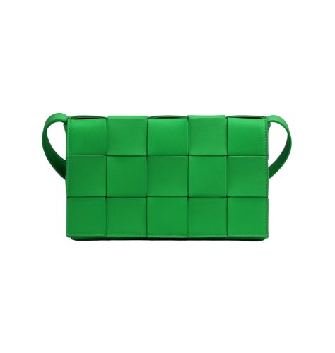 Sculptural and iconic, but still practical. The padded leather weave holds up well on the go, and the interior fits more than you’d think. Adjustable strap, flap-top closure, all dialed in.