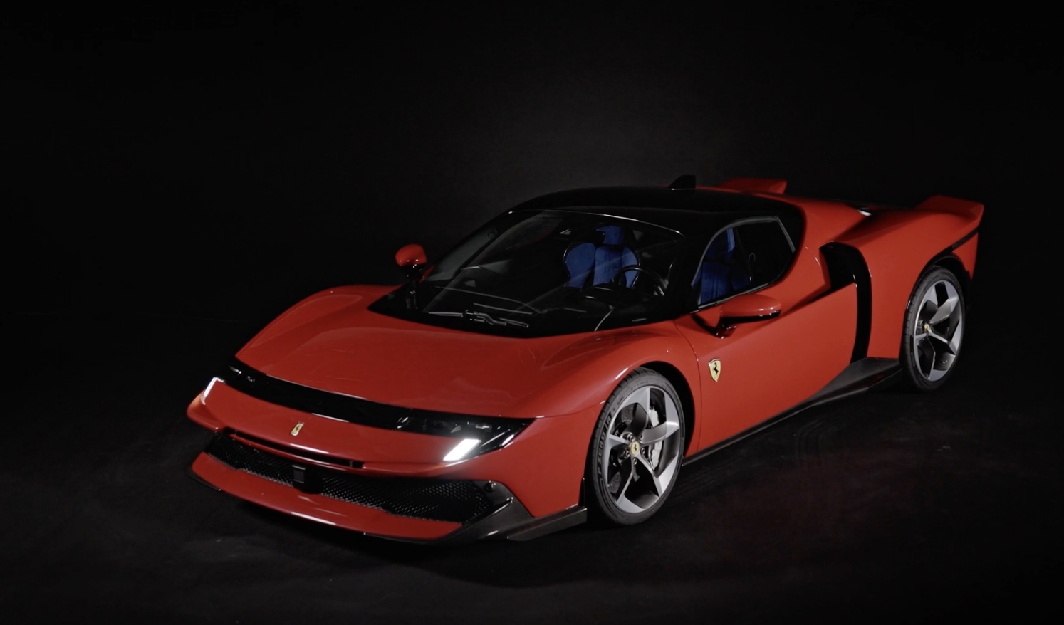 Inside the Rosso Fiammante, a metallic evolution of the classic Rosso Corsa, the cabin showcases a blue alcantara interior — a dramatic, unexpected contrast that underscores Ferrari’s evolving design language.