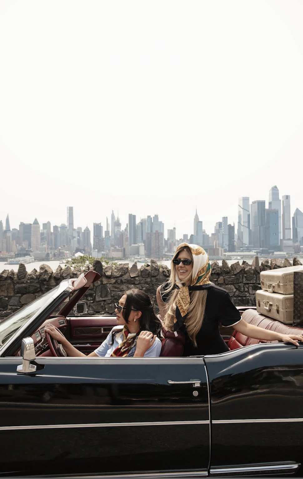 GOTG: After hosting the podcast for nearly seven years, we have come to realize that our audience has grown with us through life’s milestones and changes. What started as two college gals navigating early adulthood has now become a space where we explore just about everything. The rebrand was important because it reflects the evolution of both our lives and community. We wanted the look, feel, and tone of the show to match where we are today: elevated, yet still authentic. The process was very collaborative, involving numerous Pinterest boards and creative individuals. It took us some time to nail down the exact direction we wanted to take, but landing on a few unique “moments,” such as the vintage car scene and the escalators, helped everything else come together. We were fortunate to work with many inspiring and incredibly talented women throughout the rebranding process.