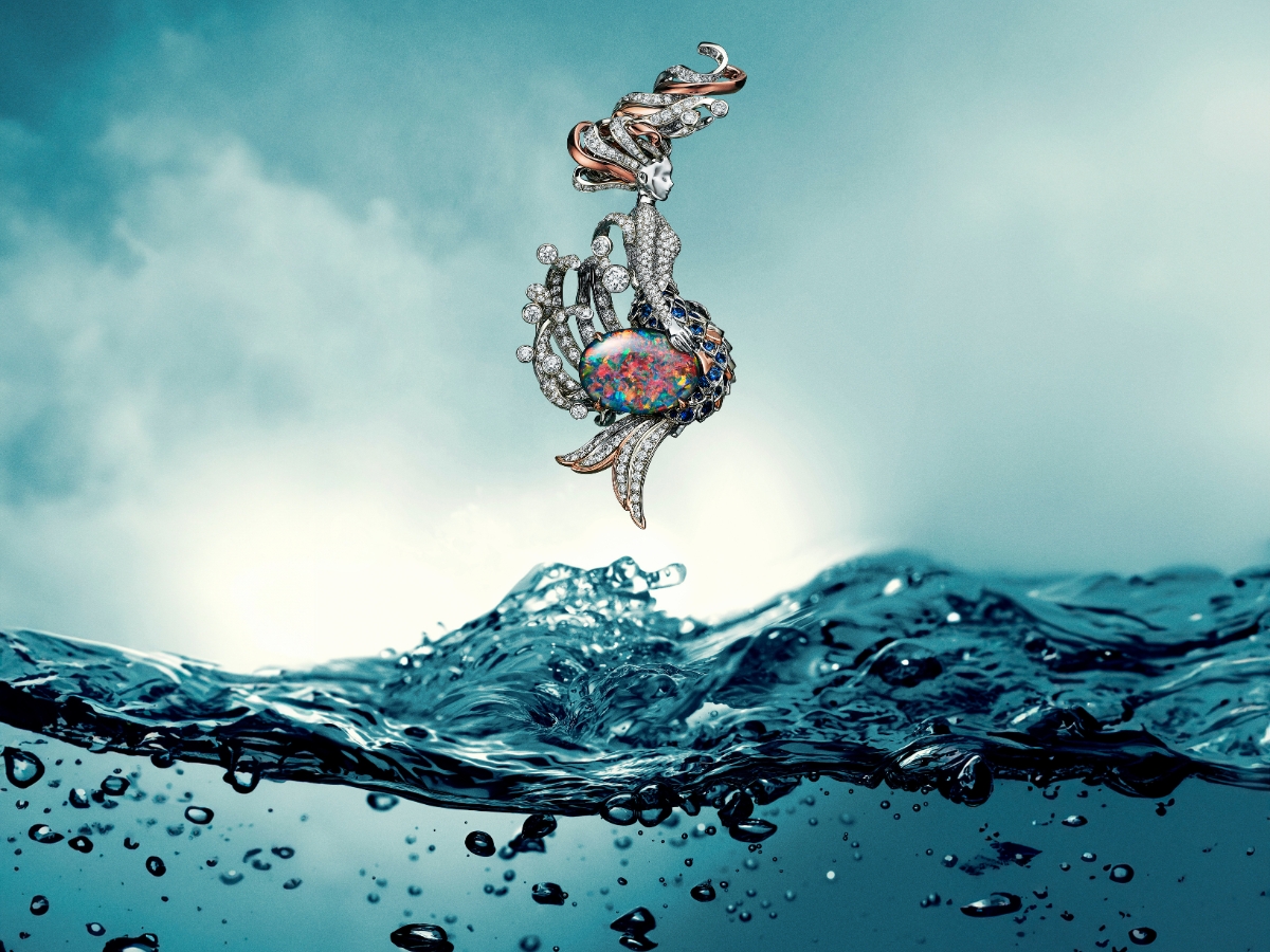 Each of the six chapters reveals a distinct side of the ocean. Anchor opens with architectural lines and cushion-cut diamonds that reimagine Schlumberger’s 1939 brooch. Anemone follows with sculptural gold and diamonds, its energy heightened by three vivid Mozambique rubies. Shell celebrates natural architecture with undulating platinum and gold curves crowned by an 8.62-carat green tourmaline. Urchin glitters with 19th-century paillonné enamel, catching light like rippling water. Mermaid calls to mind the mythical siren, featuring a 10-carat black opal set in platinum and rose gold with matching jewels. Finally, Ocean Flora closes the story with a one-of-a-kind timepiece featuring a mother-of-pearl dial, turquoise hour marker, and diamond bracelet.