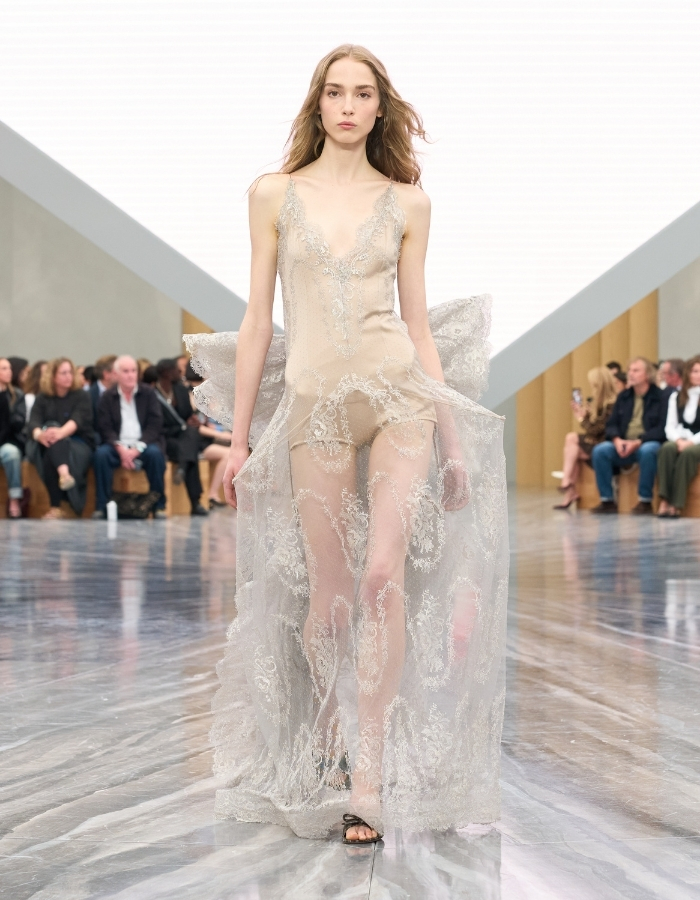 The collection opened with a white dress that curved into a sculptural bell shape, its crisp lines anchored by oversized bows. What followed was a play of contrasts: tailored jackets cropped to the waist, transparent lace dresses edged with spikes of fabric at the hips, and jersey gowns twisted like modern-day togas. At the same time, flashes of denim and floral blouses grounded the fantasy in everyday life.