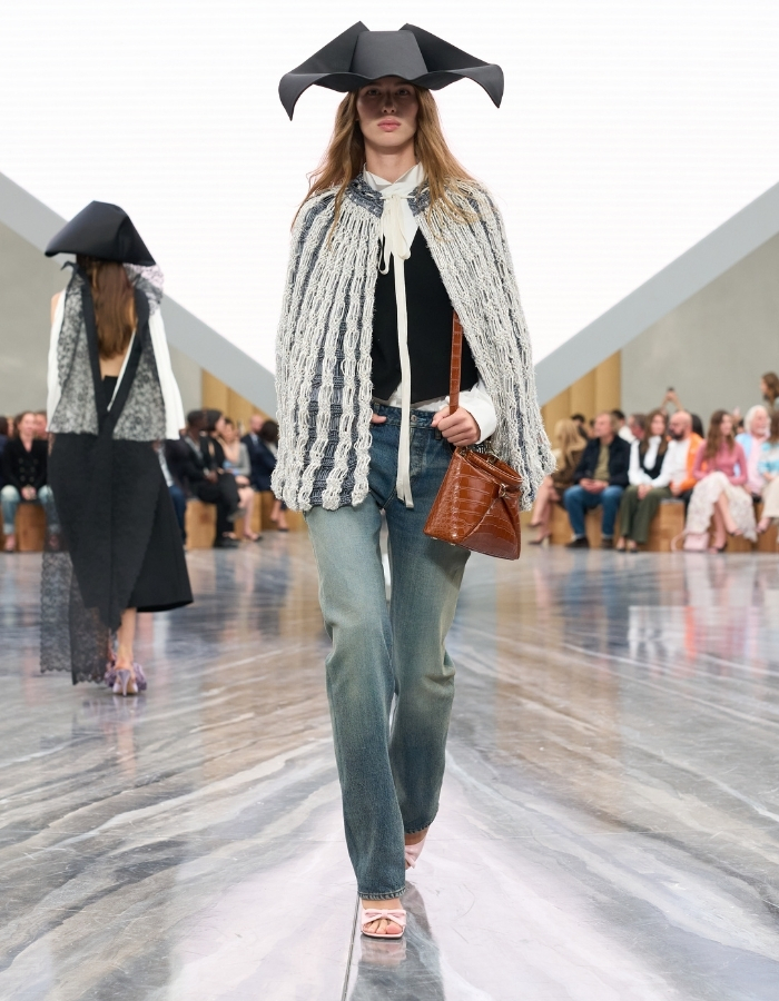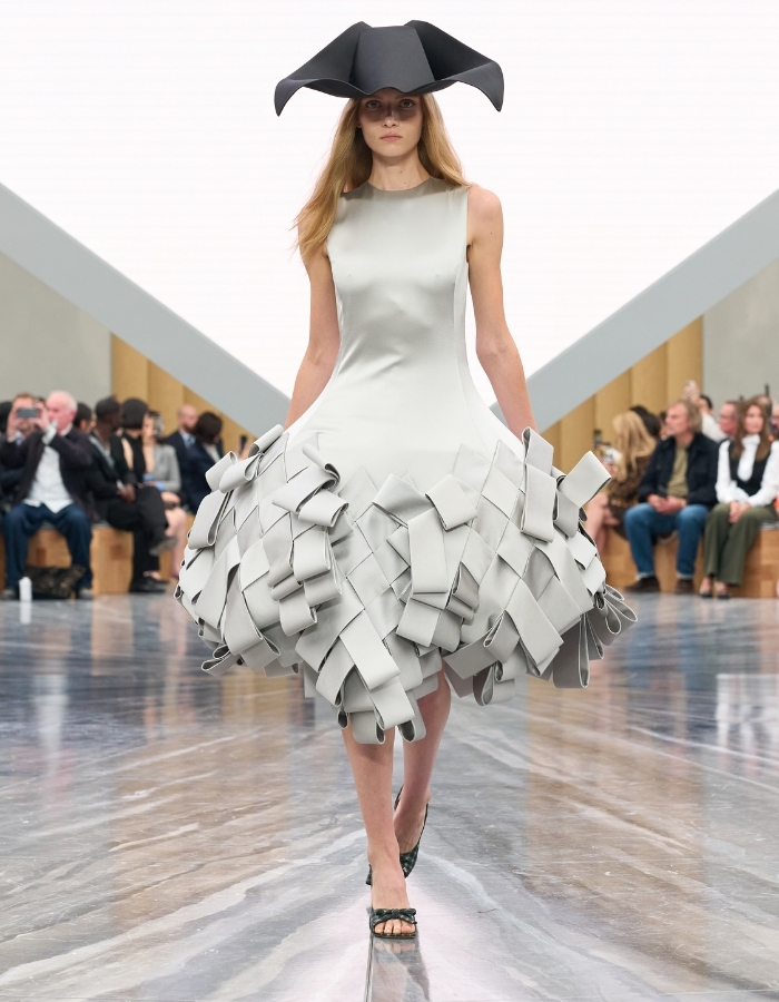 The house’s icons were not forgotten. The Bar Jacket returned with shrunken proportions and a spark of irreverence. Meanwhile, lace dresses evoked Dior’s 1952 Cigale silhouette, reimagined with a newfound lightness. Oversized origami hats—conjured by milliner Stephen Jones—nodded to the theatricality of the Galliano era. In this way, the collection reminded the audience how Dior’s past continues to echo on its runways.