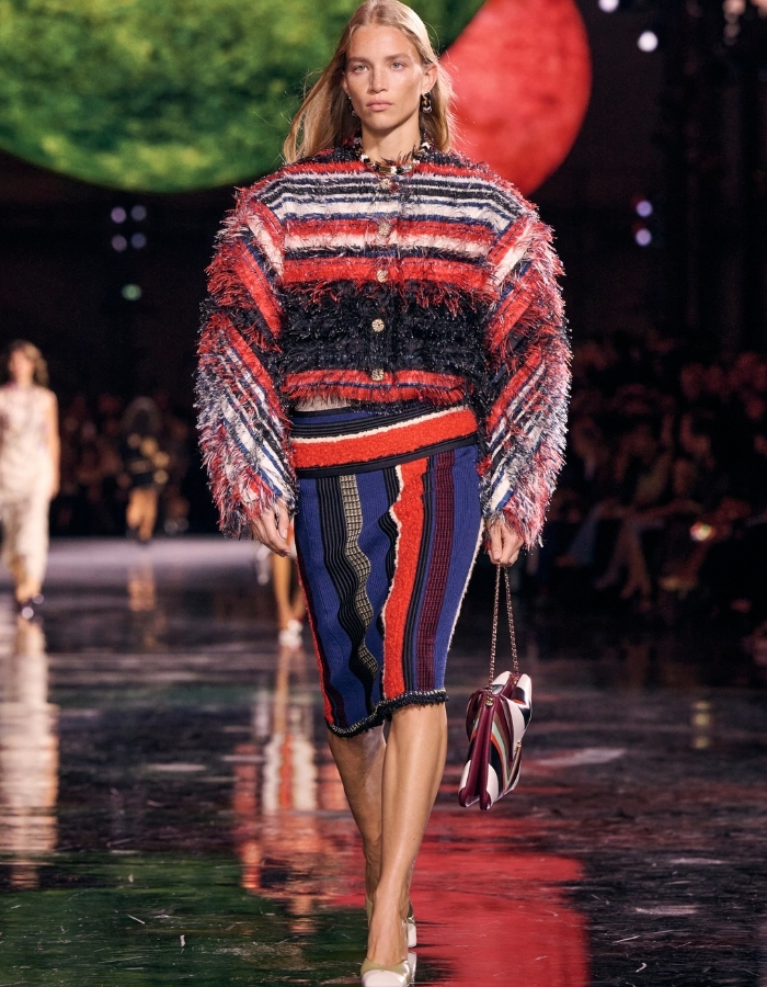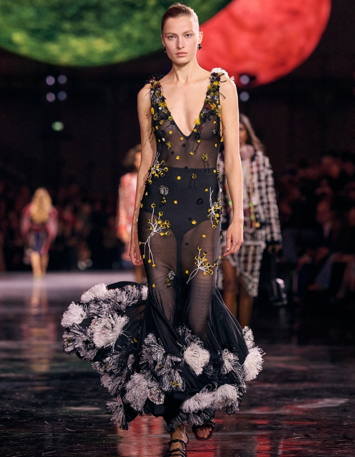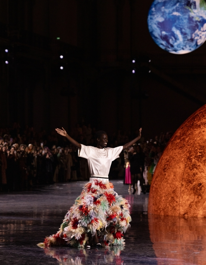 The progression built toward fluid, otherworldly glamor: feathered skirts in explosions of color, sheer embroidered gowns, and striped knits that blurred craft and modernity. Each look moved like a conversation between strength and softness, history and invention.