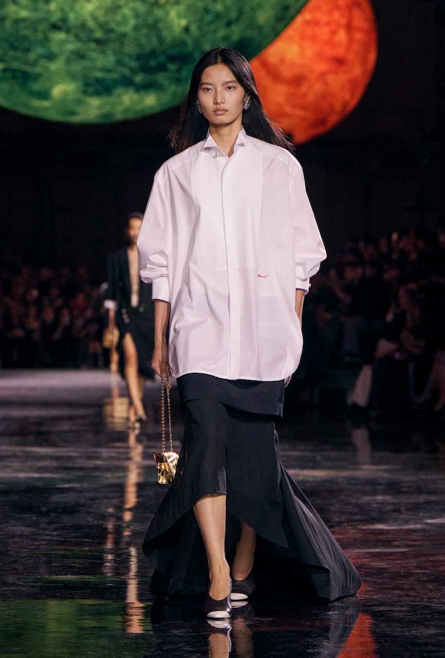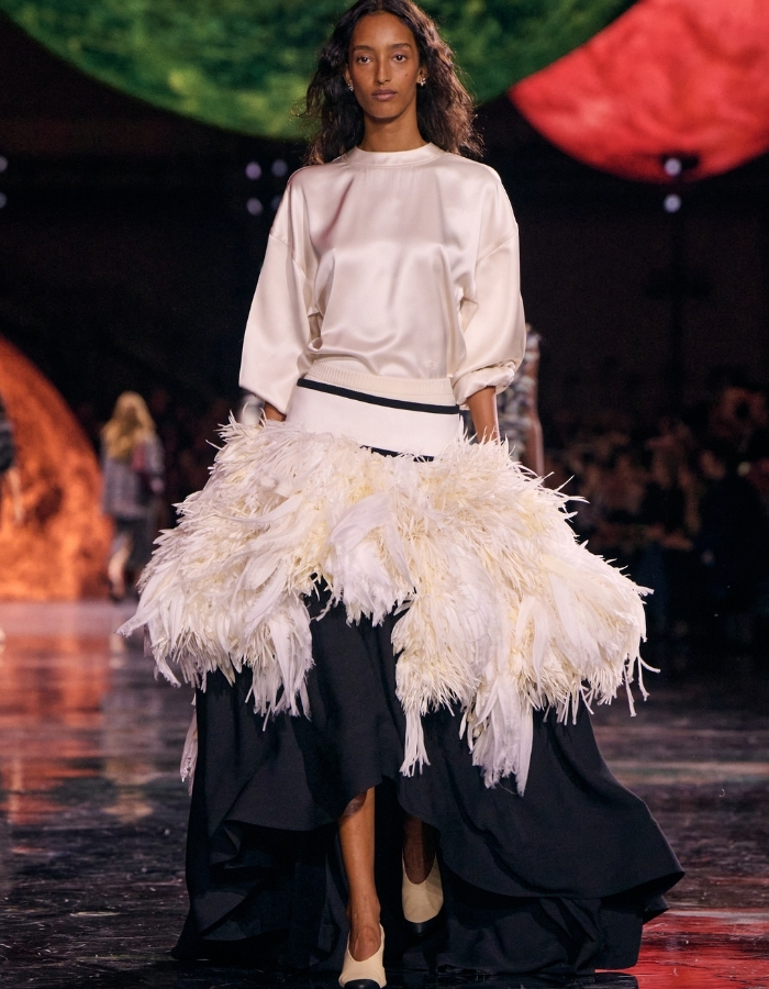 Blazy’s Chanel doesn’t chase nostalgia; it redefines it. The black-toe pumps, the pearls, the chains all remained, but their presence felt freer, less ceremonial. A white satin T-shirt paired with a cloud of feathers closed the show, distilling the collection’s message: elegance without constraint.