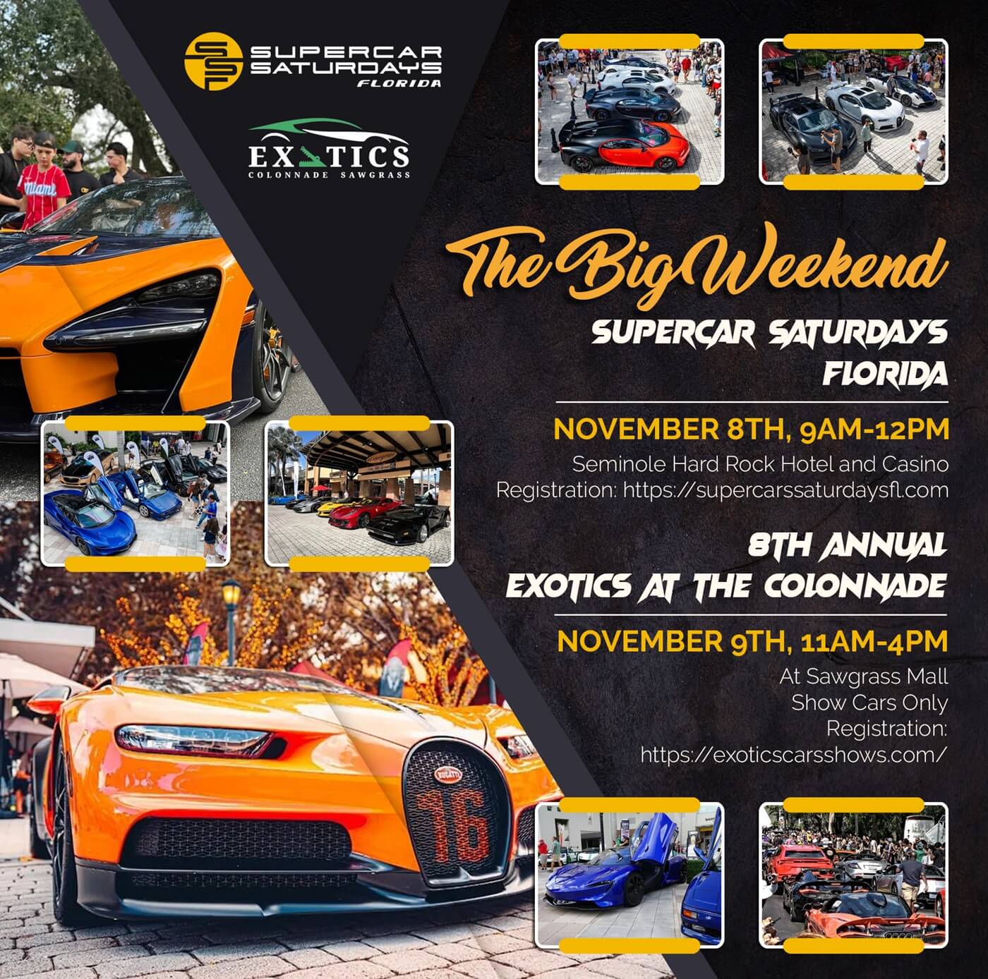 Saturday, November 8 features Supercar Saturdays Florida at the Seminole Hard Rock Hotel & Casino in Hollywood, FL, while Sunday, November 9 presents Exotics at The Colonnade at Sawgrass Mills in Sunrise, FL. Two extraordinary days, hundreds of exotic machines, and one legendary South Florida weekend celebrating the finest vehicles, people, and lifestyle experiences.