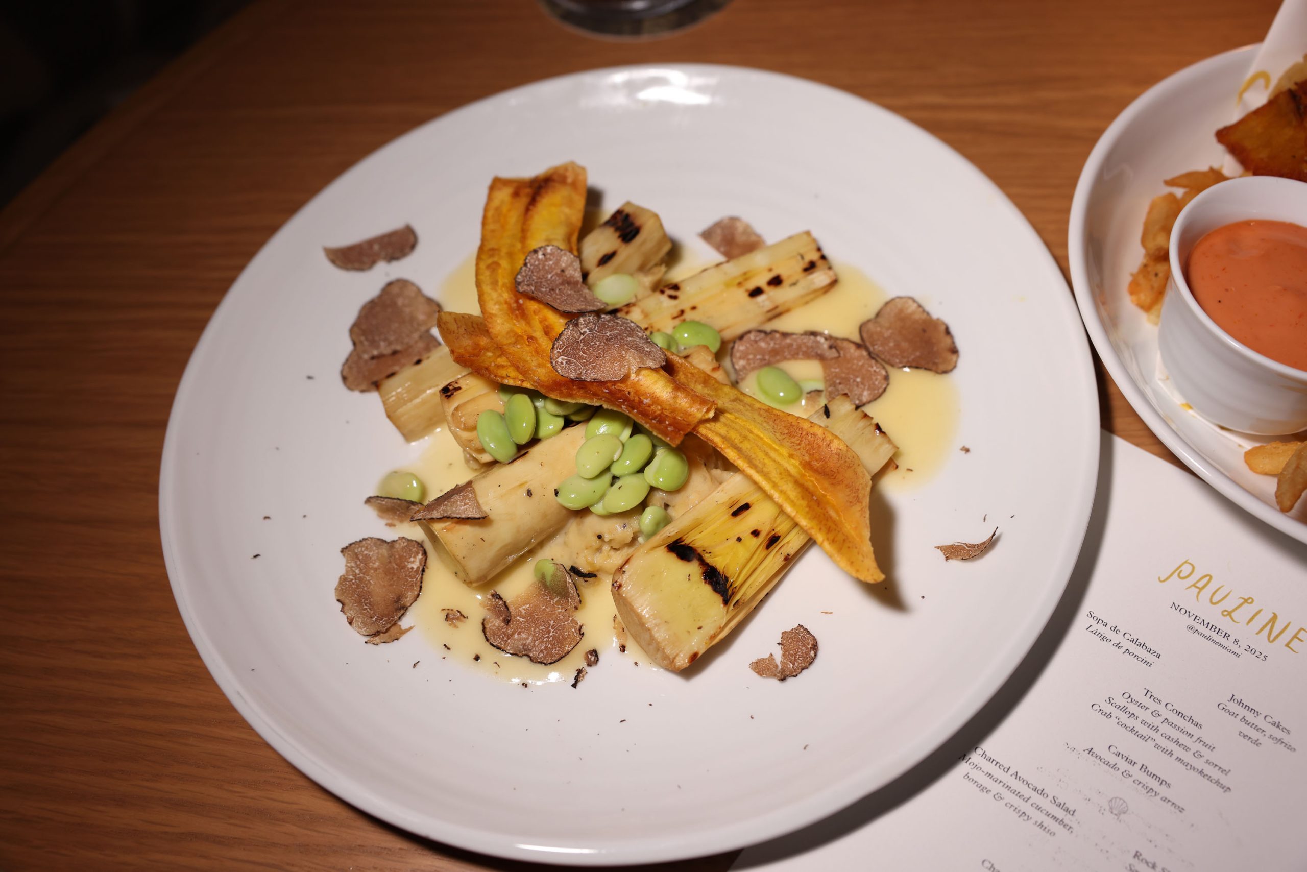 If you were to go and only order the Sopa de Calabaza and the house bread, you’d already be satisfied—rich, flavorful, and comforting enough to make you forget there’s more to come. But then came the Tres Conchas, a tower of oysters, scallops, and crab that arrived like art. The Rock Shrimp Fideos and Charred Avocado Salad demonstrated that texture and technique can still feel indulgent. The Charcoal-Roasted Hearts of Palm with black truffle mangu was another highlight—unexpected and deeply satisfying.