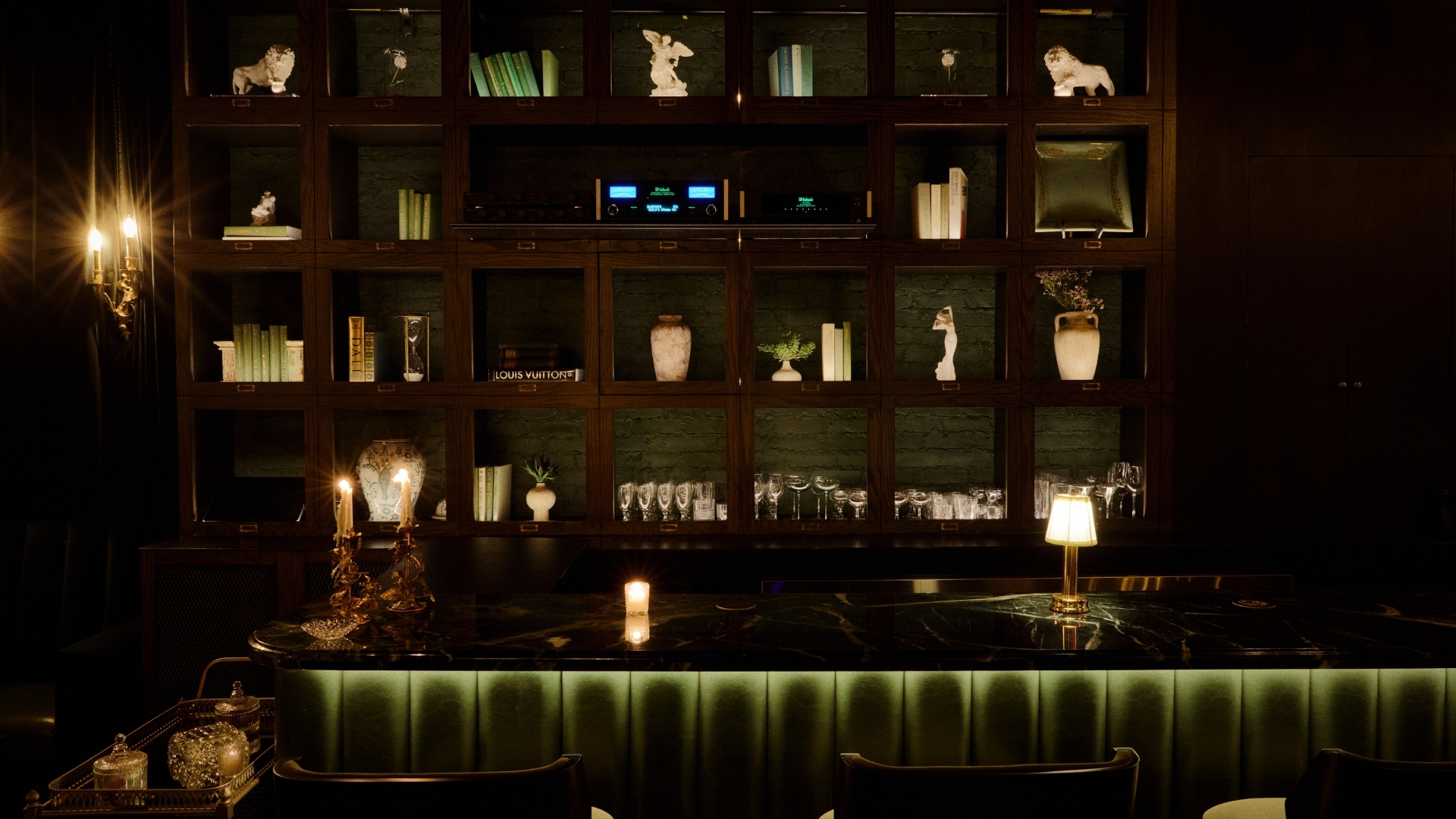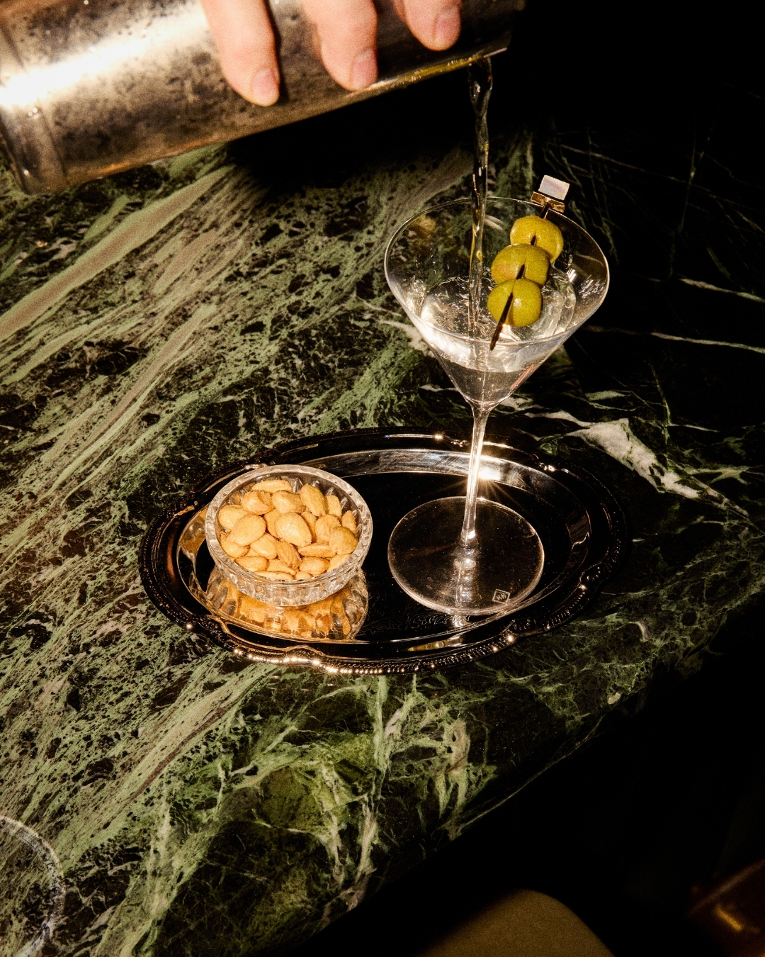 Designed by Emily Pires and Elena Hristu of E&E Creative, the interior is defined by rich materials and low lighting. A softly illuminated 17 seat bar runs the length of the room, finished with fluted paneling and topped in deep green marble with pronounced white veining. Overhead fixtures cast a warm glow across a palette of greens, golds, and amber tones.