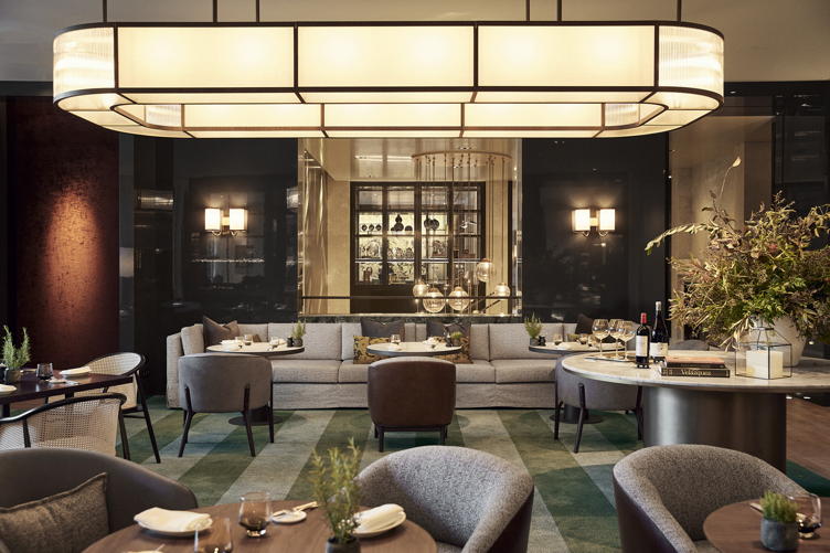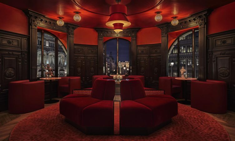 Following seven years of meticulous restoration and reconversion — led by architects at Estudio Lamela in Madrid with a team of international designers that includes BAMO, BG Architecture, Martin Brudnizki, AvroKO, and Luis Bustamante — on a set of seven historically and architecturally valuable buildings, more than 16,000 pieces were removed, catalogued, and restored — Many of which can now be found in the suites and common areas around the hotel, such as green marble pillars with gold-plated capitals that decorate the lobby and the original stained glass window from its previous life as a bank.