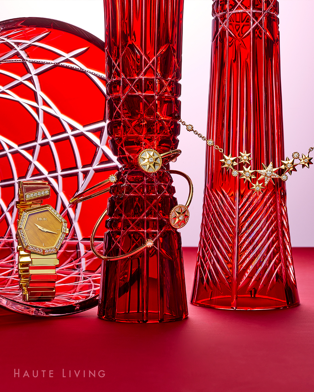 Dior Maison Valentine’s Day Collection Crystal candlesticks and vase, price upon request; Dior Fine Jewelry Rose des Vents necklace $18,600; Rose des Vents bracelets $4,100-$4,450; Dior Timepieces Gem Dior timepiece, price upon request; available at Dior boutiques nationwide and 1-800-929 Dior