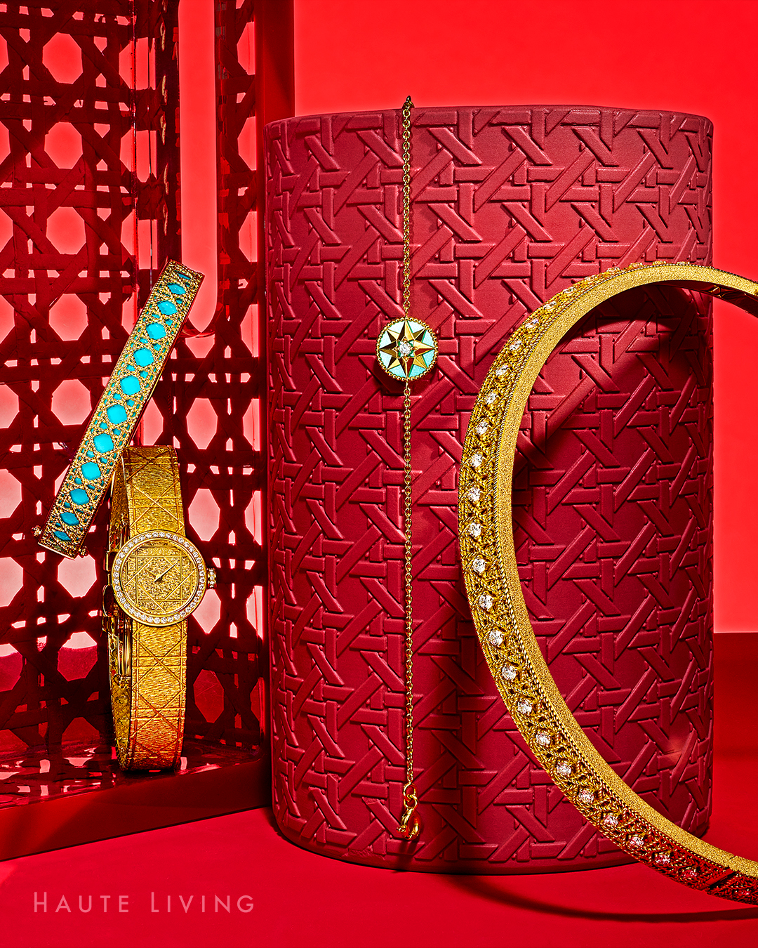 Dior Maison Cross Cannage small tray, $550; Vase, price upon request; Dior Fine Jewelry My Dior necklace price upon request; My Dior bracelet $10,000; Rose des Vents necklace, $2,500; Dior Timepieces La Mini D My Dior timepiece, price upon request; available at Dior boutiques nationwide and 1-800-929 Dior