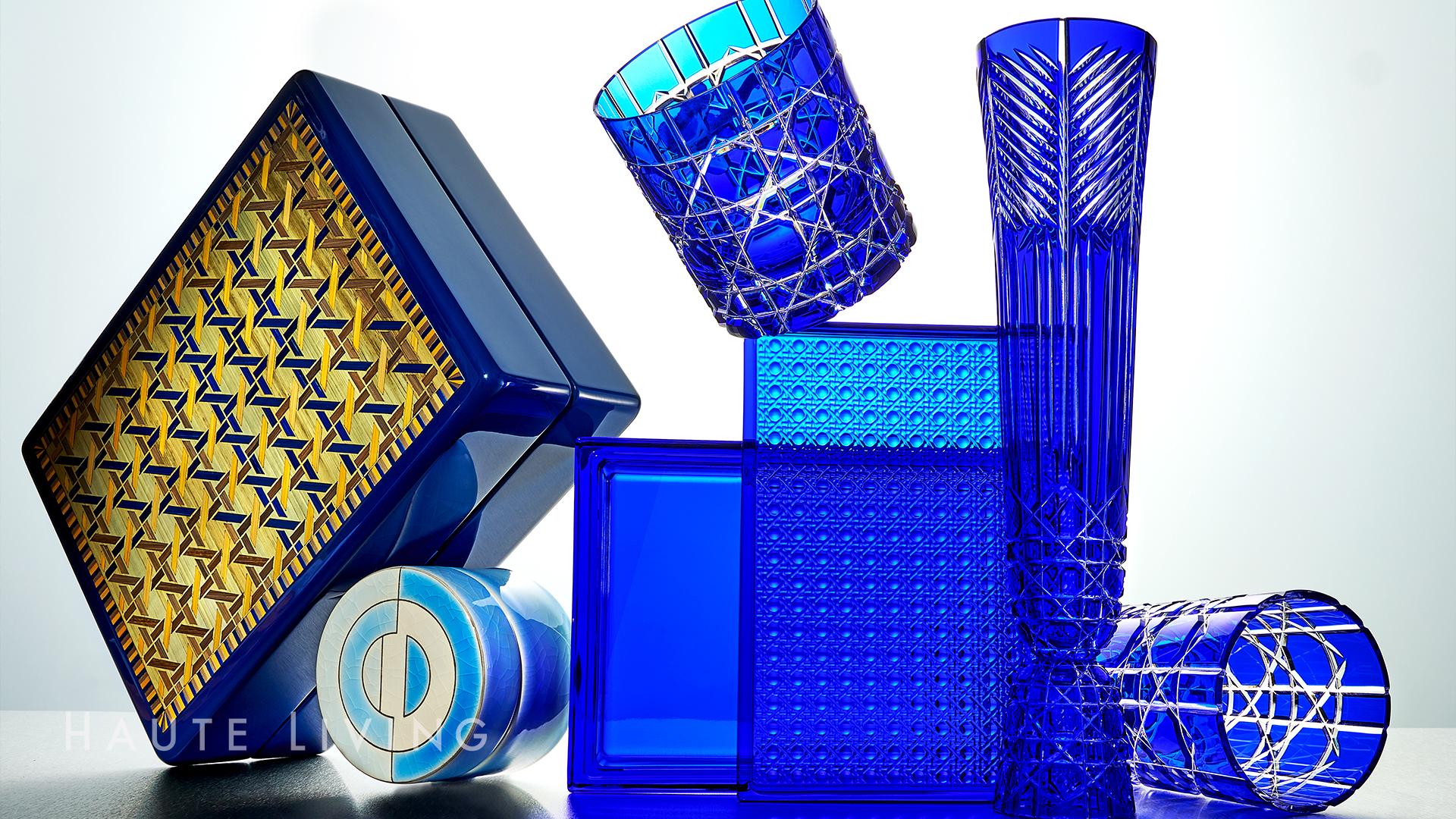 Dior Maison Cross Cannage large jewelry box, $4,100; CD Entrelace trinket, $550; Dior Maison Crystal tumbler, candlestick, Large drinking glass, and box, price upon request; available at Dior boutiques nationwide and 1-800-929 Dior
