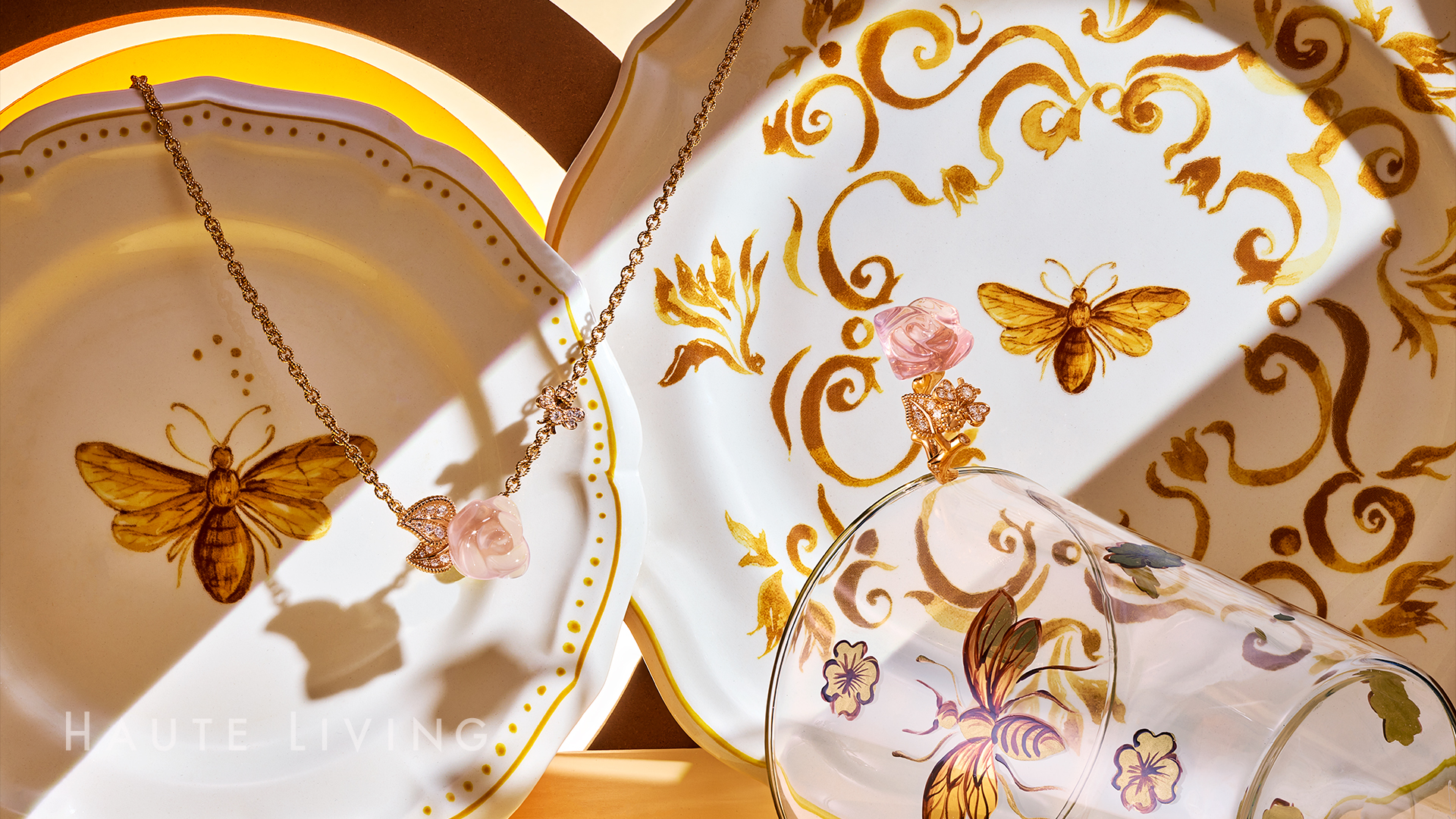 Dior Maison side plate, $140, and Dior Fine Jewelry Rose Dior Pré Catelan necklace, $16,100; Dior Maison dessert plate, $190; Water glass, $300; Dior Fine Jewelry Rose Dior Pré Catelan ring $12,600; available at Dior boutiques nationwide and 1-800-929 Dior