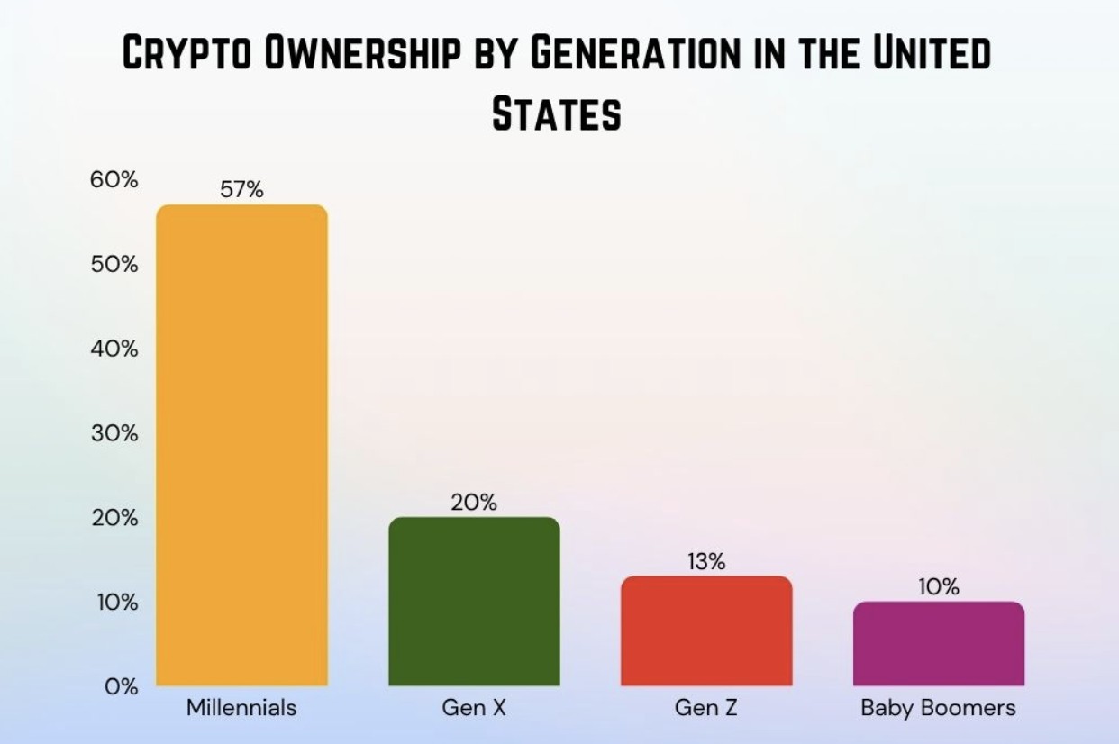 In fact, Gen Z and Millennials account for nearly 60% of all crypto users worldwide, and young adults are twice as likely to invest in cryptocurrencies as their older counterparts. Only 8% of U.S. citizens aged 65 or older own crypto, according to the study cited above.