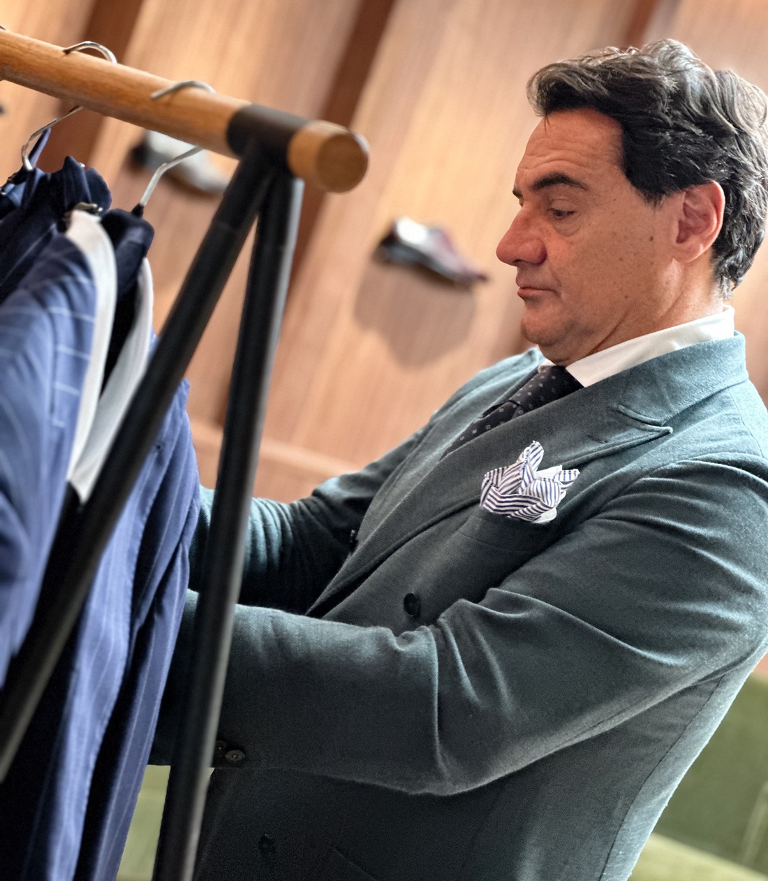 At the core of Duca Sartoria’s philosophy lies a simple yet powerful framework: fabrics, cuts, and details. Every garment begins with an obsessively curated selection of premium textiles sourced from the world’s most prestigious mills, including Loro Piana, Zegna, and Holland & Sherry. Cashmere and silk remain personal favorites of Girombelli, chosen for their versatility and ability to transition seamlessly from boardroom mornings to evening engagements.