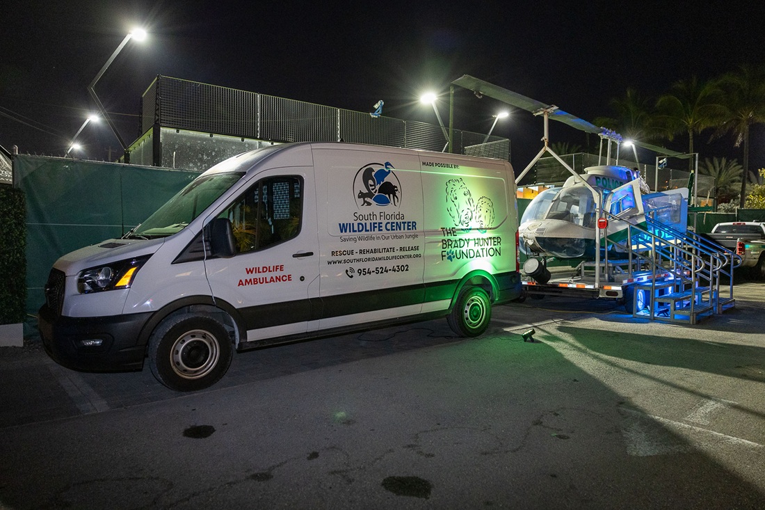 Beyond the adoptions, the evening featured a series of memorable and highly visual experiences. The South Florida Wildlife Center’s rescue ambulance gifted by The Brady Hunter Foundation was on-site for guest tours and photo opportunities, highlighting the critical, behind-the-scenes work involved in saving injured wildlife across the region. Adding to the excitement, the Miami-Dade County Sheriff’s Office helicopter made a special appearance, underscoring the community partnerships that make lifesaving work possible.