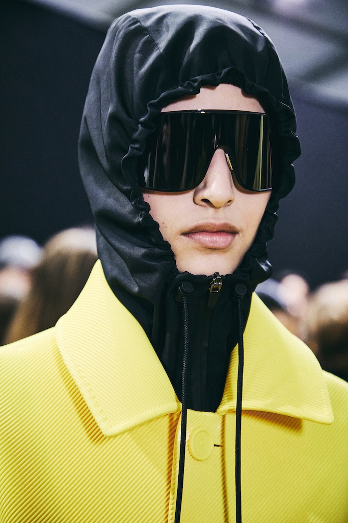 The collection also pushed silhouettes outward. Parkas and scarves appeared as inflatable volumes. An industrial technique laser cuts and seals the seams, allowing air to become part of the garment’s structure. Texture introduced another layer of experimentation. Bouclé coats used looped lacquered leather, while tartan knits relied on ultra thin leather yarn. Pastel shearling coats and corduroy trousers featured soft gradient trims reminiscent of poodle grooming. The effect softened otherwise structured pieces.