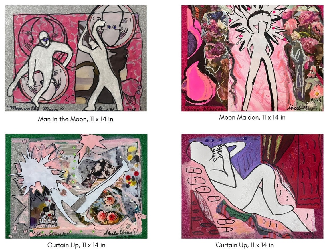 “Man in the Moon” explores identity and observation through celestial symbolism. “Moon Maiden” highlights feminine energy and spiritual connection with nature, while the works titled “Curtain Up” evoke theatrical moments of transformation and revelation.