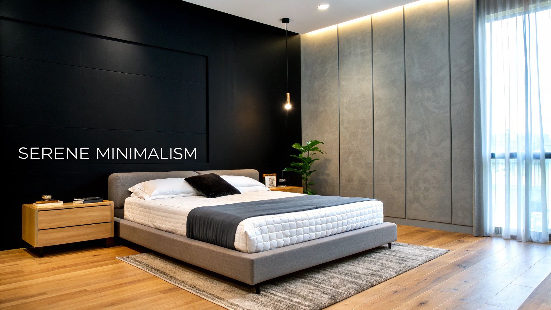 The success of this style hinges on intentionality. Every element, from the shade of gray on the walls to the texture of a throw blanket, is chosen for its ability to contribute to a cohesive and calming atmosphere. The example above demonstrates this by using large-format concrete panels, which introduce subtle texture and an industrial edge without adding visual clutter. The deep charcoal or black accent wall behind the bed creates a powerful focal point, grounding the space and adding significant depth.