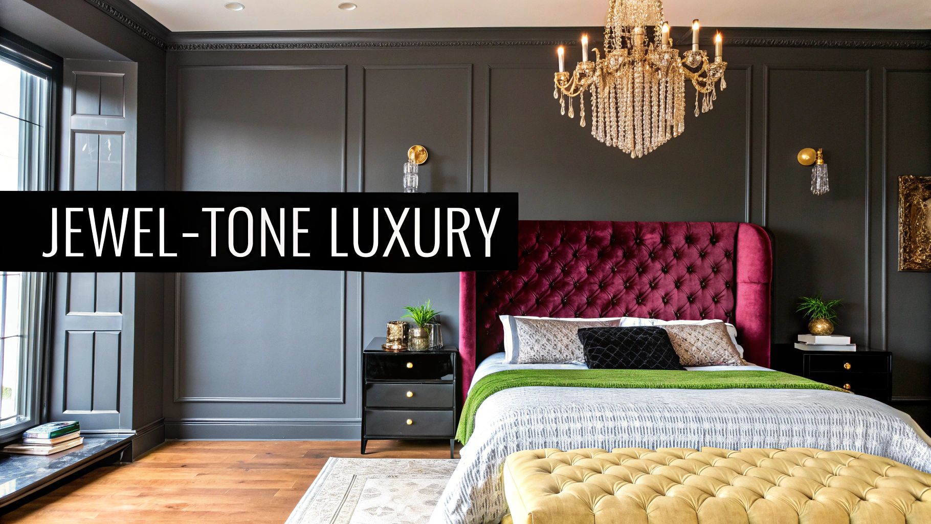 4. Luxury Gray Bedroom with Jewel-Tone Accents