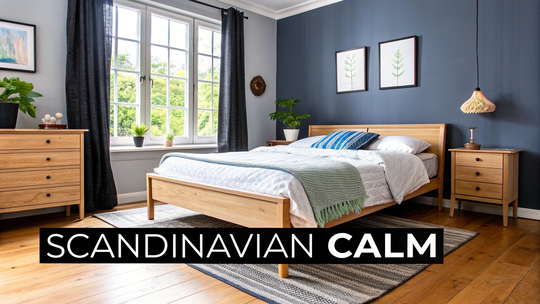 5. Scandinavian Gray Bedroom with Natural Light and Wood Tones