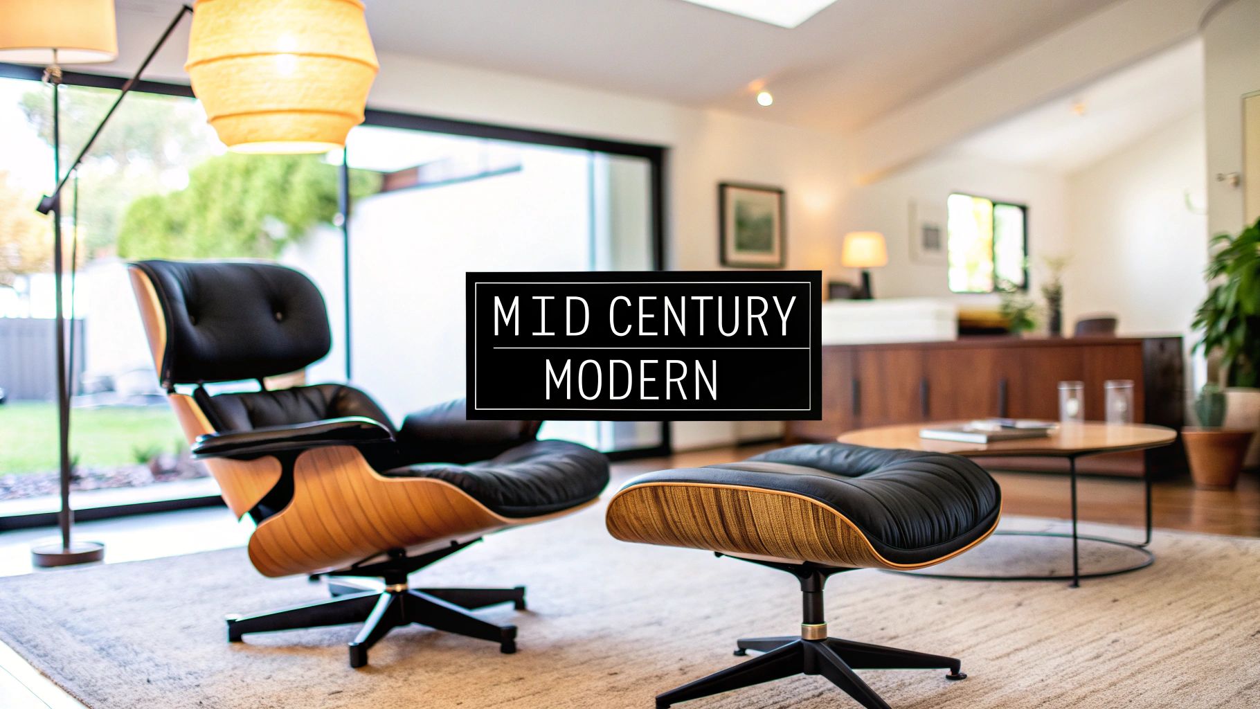 Explore our expert guide to mid century modern interior design. Learn the core principles, see room-by-room examples, and discover tips for a timeless look.