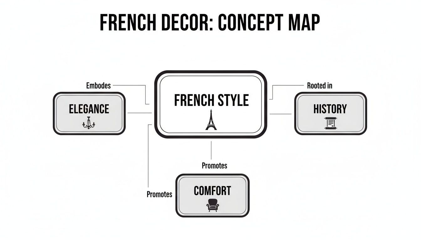 This concept map helps visualize the core pillars that hold up the entire French aesthetic: a constant, delicate balance of elegance, history, and comfort.