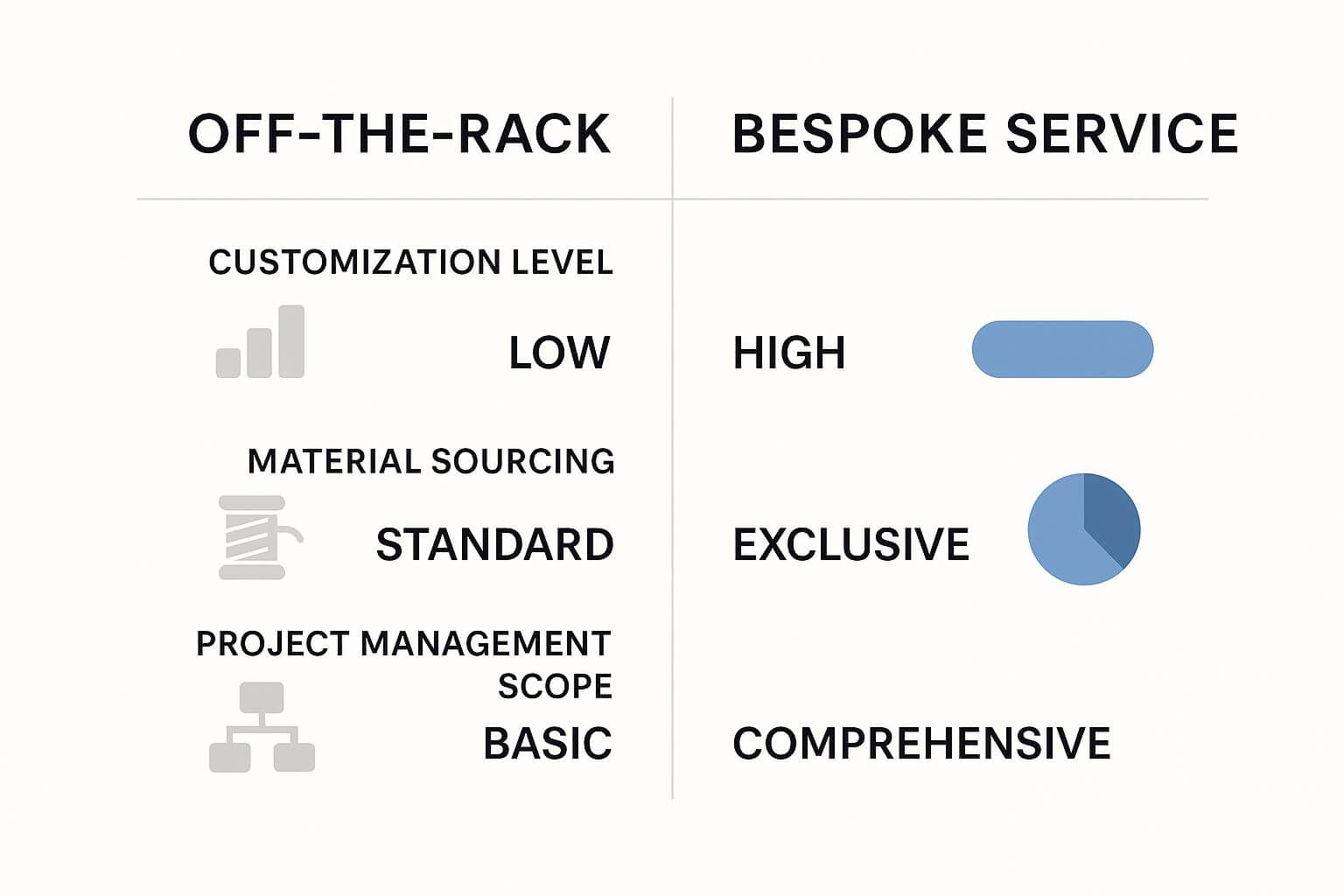 This infographic helps visualize the difference between the bespoke, all-inclusive service of a high-end designer and the more conventional, “off-the-rack” design solutions.
