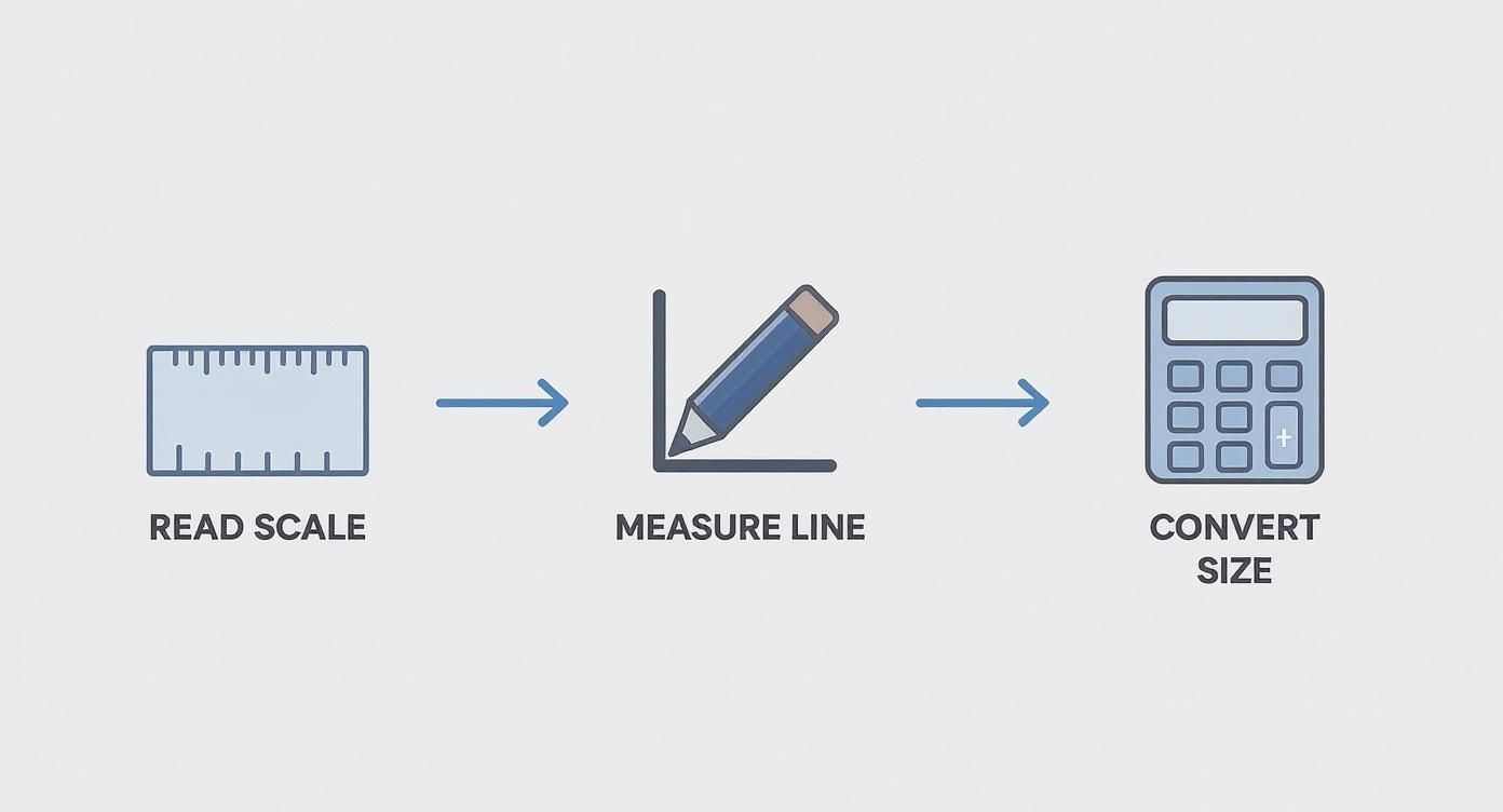 This visual guide simplifies the process of reading scale, moving from identifying the correct scale to measuring a line and finally converting it to its actual size.