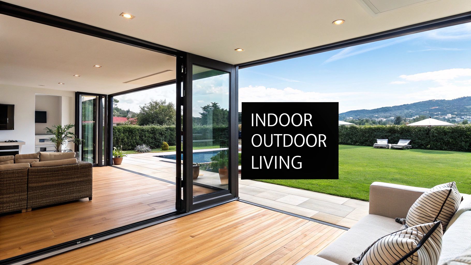 You have to consider the interior layout. How is the furniture arranged? The flow should guide the gaze toward the view, not block it. I always try to align a home’s primary seating area with the main opening or position a dining table to look out over the garden. It reinforces that psychological link between inside and out. This same principle is key to any great open-concept space, which you can dive into deeper in our guide to luxury open-floor plan design ideas. From the moment someone walks into the room, their attention should be naturally drawn to the beauty of the outdoors.