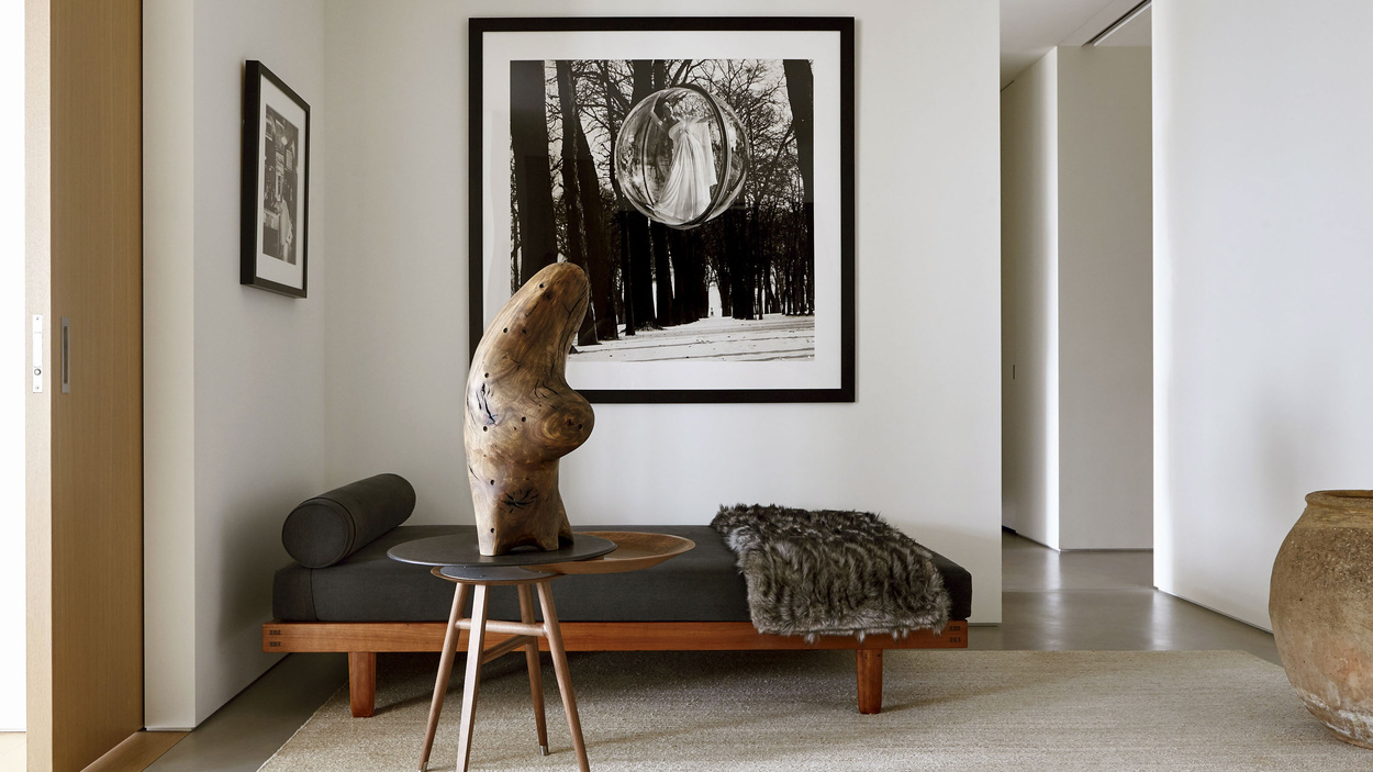 Panduro achieved it through the deft use of restrained detail and rich materials that provide the space with a lush, warm feel. Stepping off the elevator, guests enter a compact vestibule that immediately opens to an expansive entry hall, lined with iconic fashion photography, a rare Charlotte Perriand daybed upholstered in degradé charcoal linen, and Hermès leather side tables.