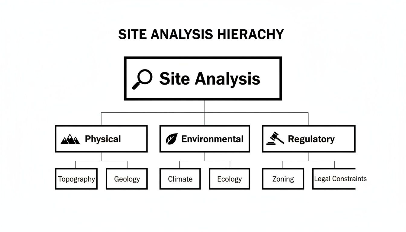 This diagram shows how we organize a site analysis into three core layers—physical, environmental, and regulatory—to build that complete profile.
